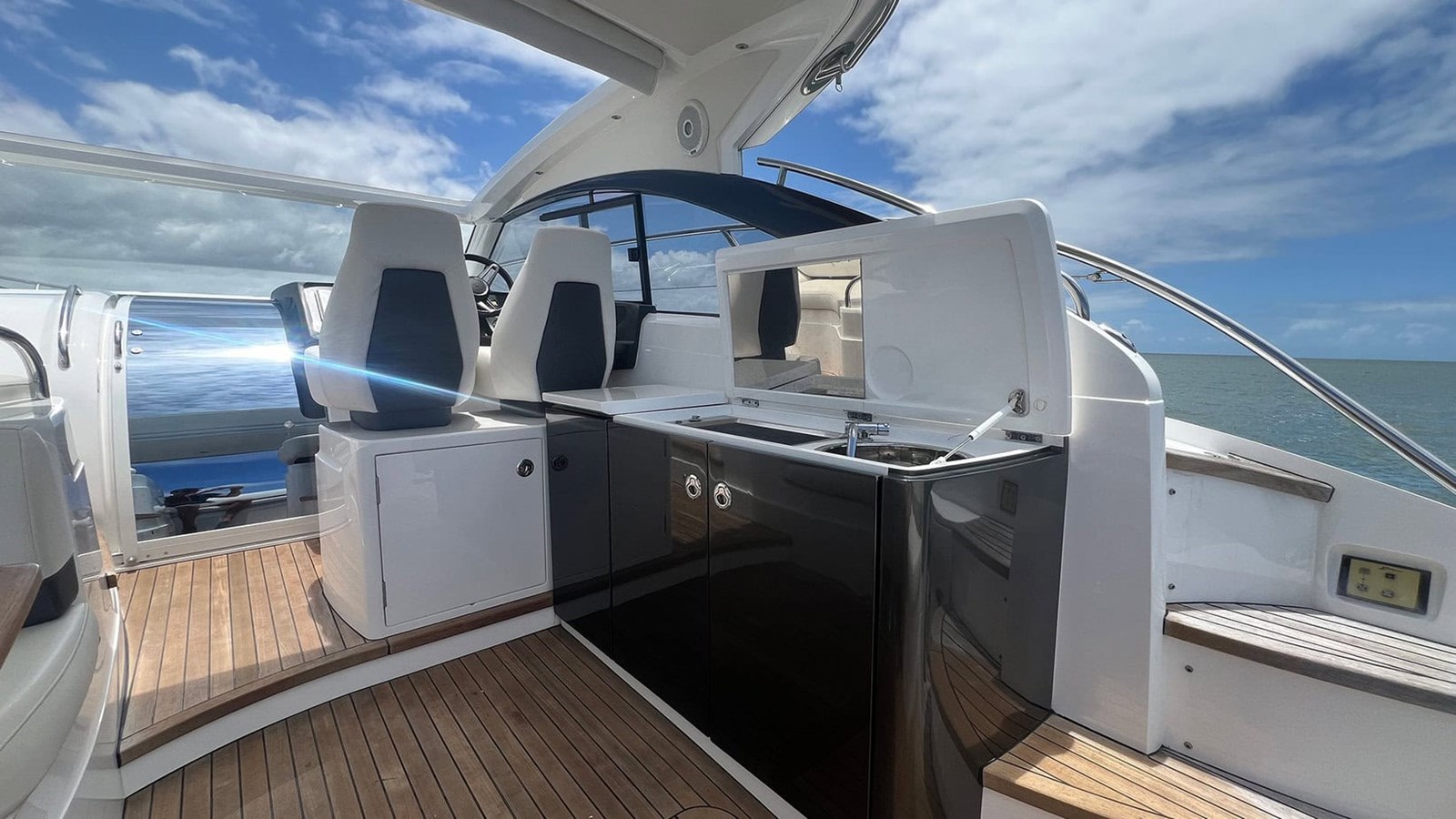 The V39’s ultra-responsive handling and exhilarating acceleration are truly impressive, and when the sunroof is opened, it creates over 5 square meters of open space, offering a genuine open-air boating experience. The spacious cockpit is designed for socializing, featuring a fully equipped wet bar and barbeque.