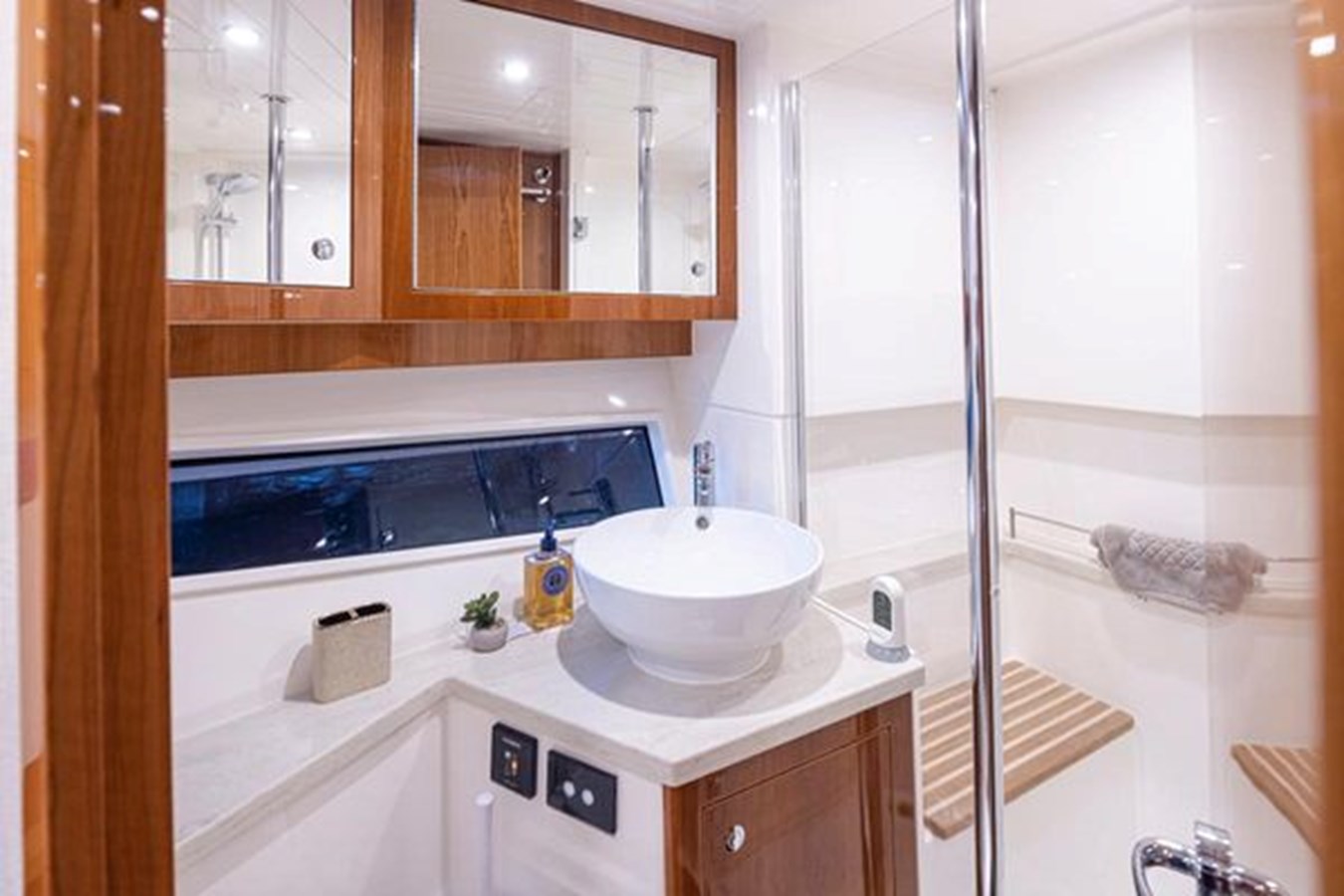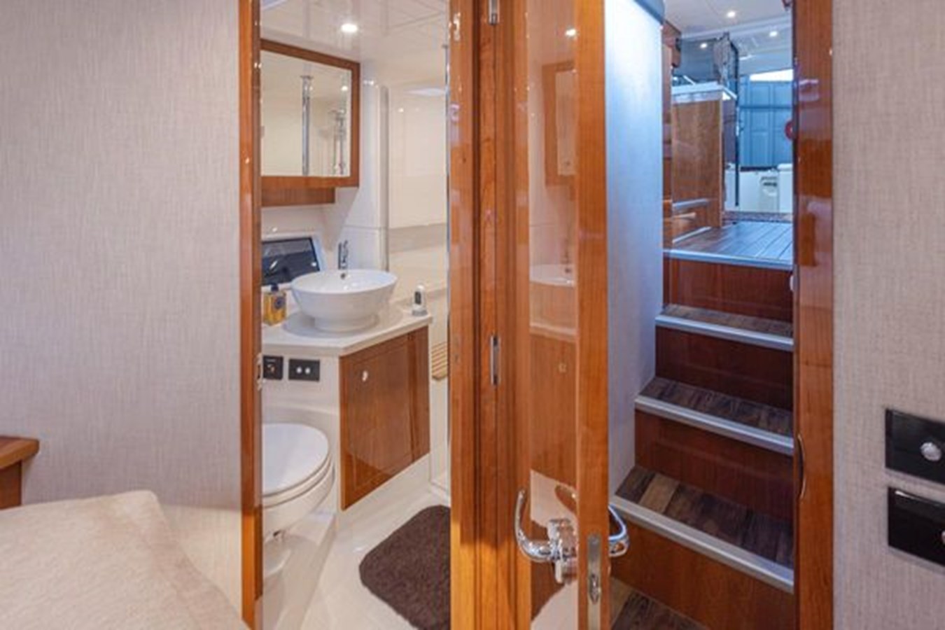 The very generous-size head includes a vanity, Vacuflush toilet and separate shower stall. With two-way access, the head can be utilized as the master en suite and day head.