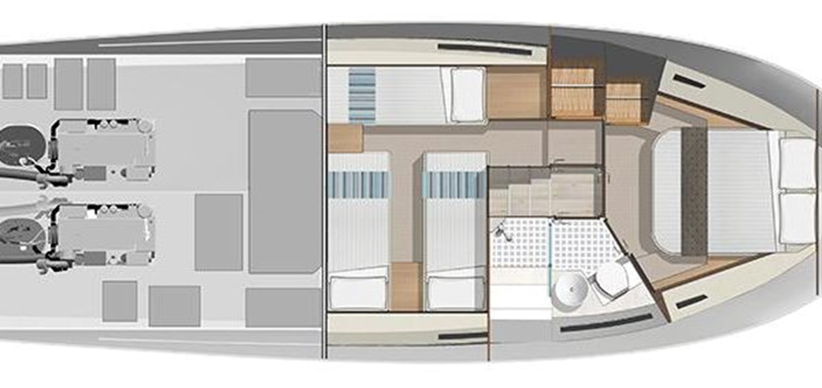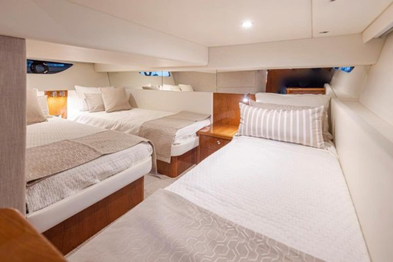 The midships cabin includes a wardrobe at the entry. The twin beds on the starboard side can be converted with an infill into a large double bed. Ample storage is available under the twin beds and a clever 6'6" long storage cabinet is overhead, above the port bed, suitable for rod or life jacket storage.