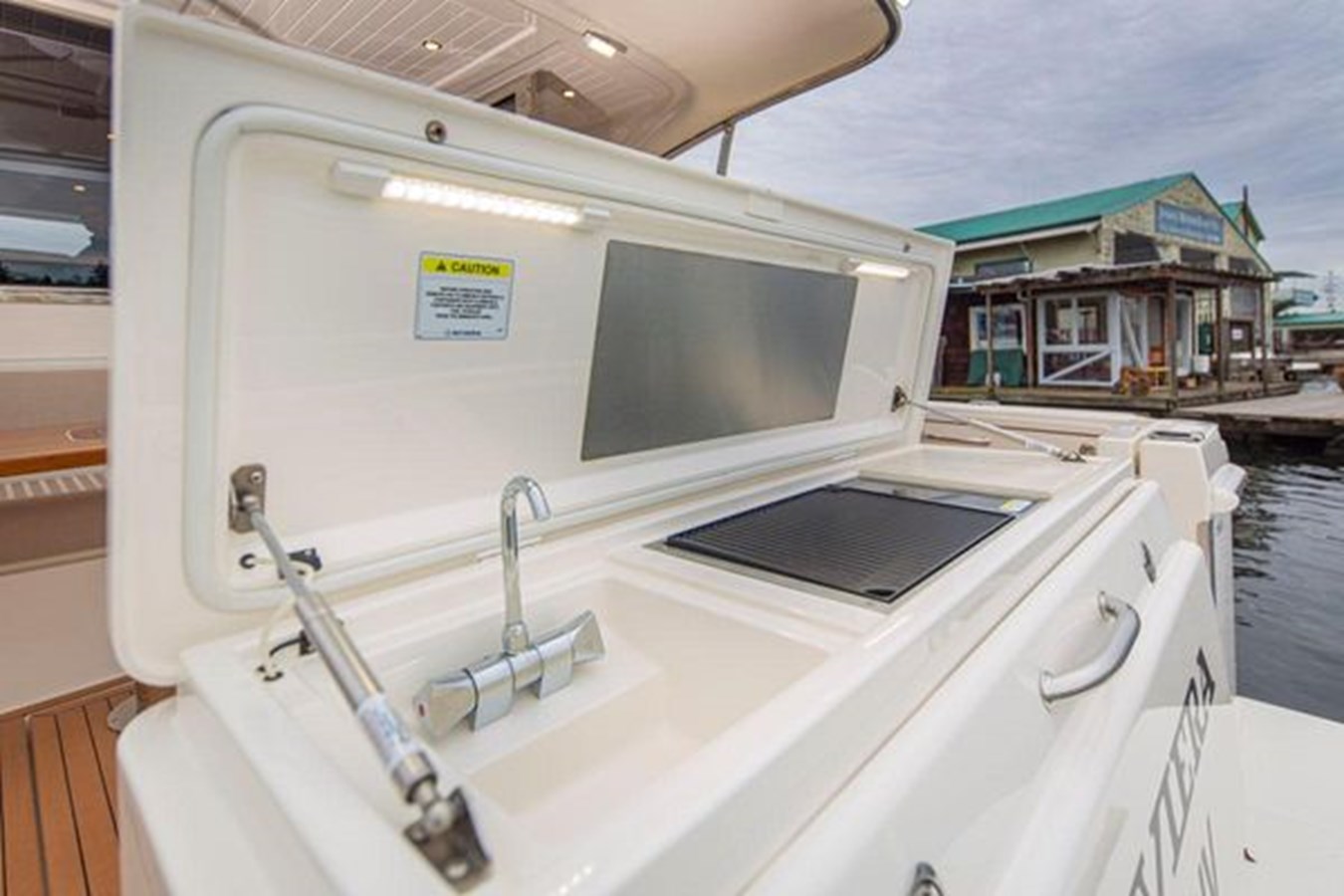 A barbecue unit with a lid and LED lighting is set across the transom, facing forward and accessed from the swim platform so the chef is at the heart of the conversation and entertainment. The unit also includes a sink and food preparation space. Below the barbecue unit, a storage hatch opens from the top with lockers along port and starboard sides, an under-floor storage or fish bin and a counter-top cabinet in the port forward quarter, below the awning windo cabinet includes a moulded sink with mixer tap, storage space under and an optional icemaker.