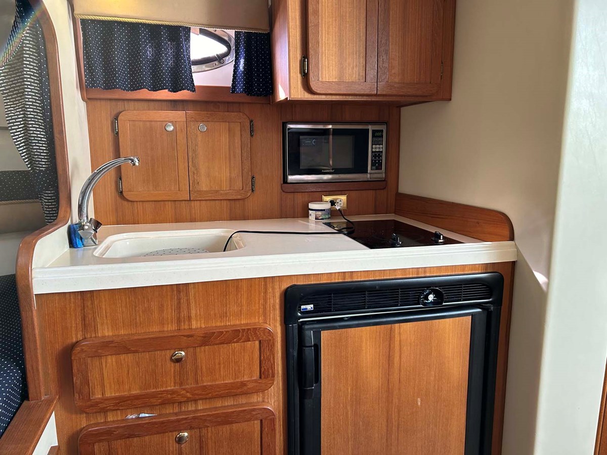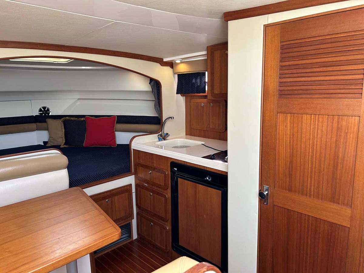 Forward is a large double berth followed by dinette to port and full galley to starboard. The head is aft of the galley starboard, second double berth compartment is full beam aft in the cabin.