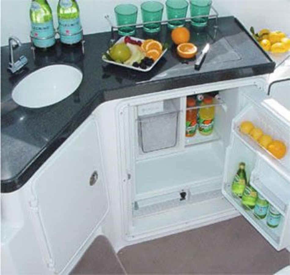 The interior design blends cherry wood finishes, Corian countertops and refined detailing, creating a warm and elegant onboard atmosphere.