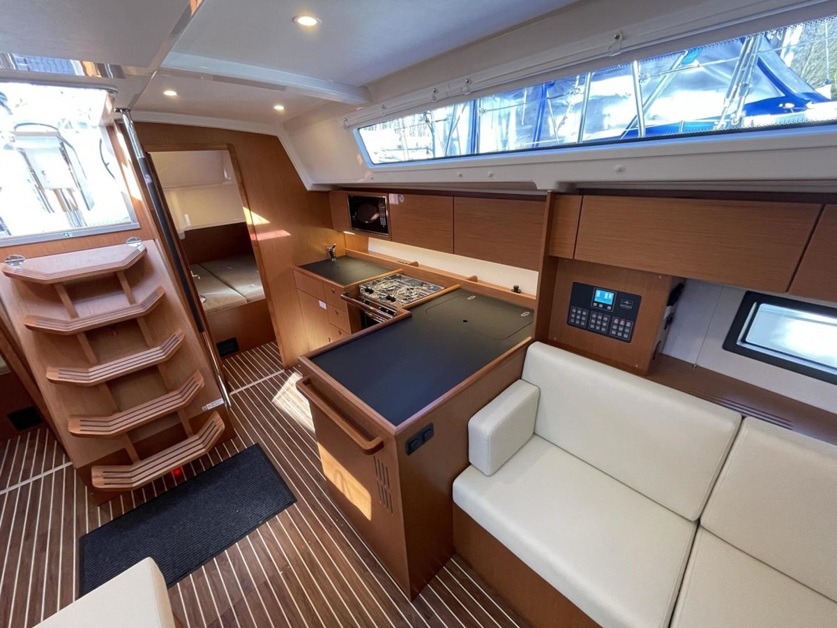 The galley, situated to port, is well-equipped for gourmet meal preparation, featuring a 3-burner stove with oven, a microwave, and a front-loading refrigerator. The black laminate countertops provide ample workspace, and the layout is both functional and stylish.