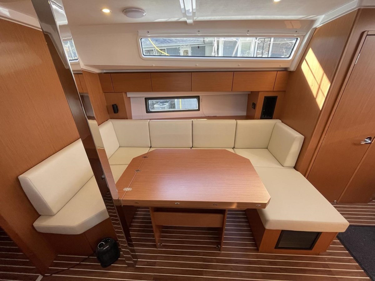- Salon: U-shaped dining area on starboard, sofa with chart table on portside