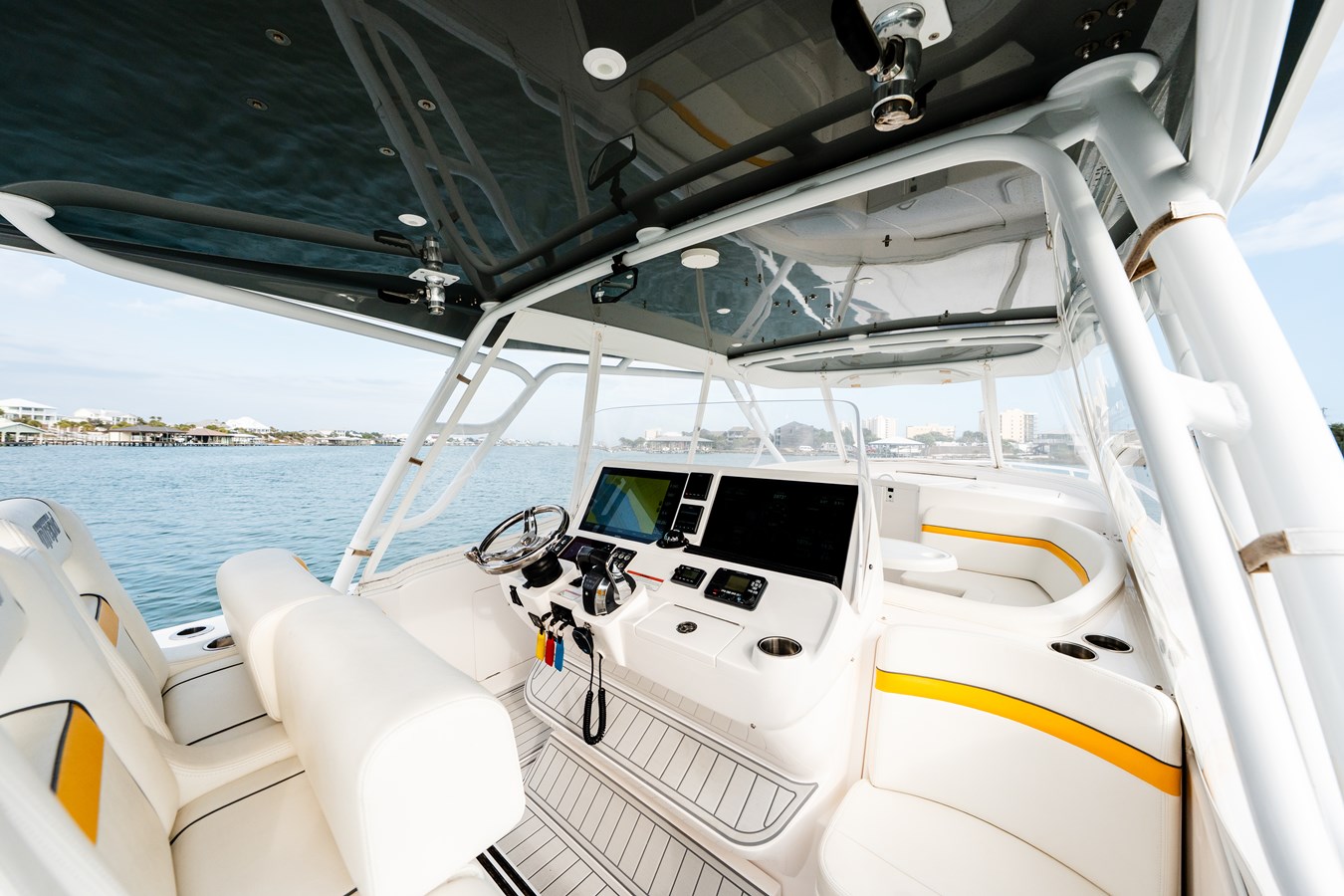 Port side forward seating and spacious console with windshield for comfort and protection underway