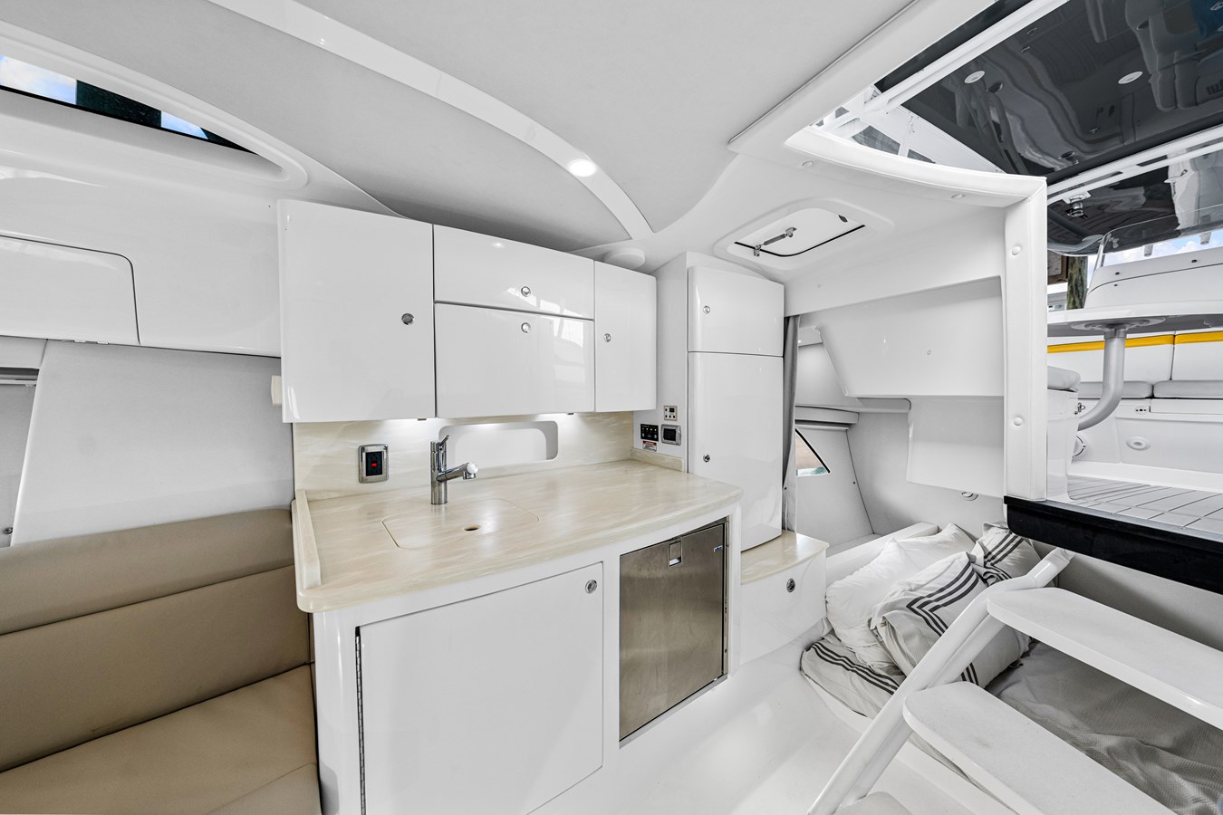 Designed for versatility, the boat features a hull side dive door with step ladder and grab rails for effortless water access, plush custom seating, a stylish wet bar for entertaining, and serious sport fishing capabilities including live wells, rod holders, tackle storage, tank storage, and a raw water wash down. It’s equally ready for weekend escapes, sunset cruises, diving adventures, or chasing fish offshore.