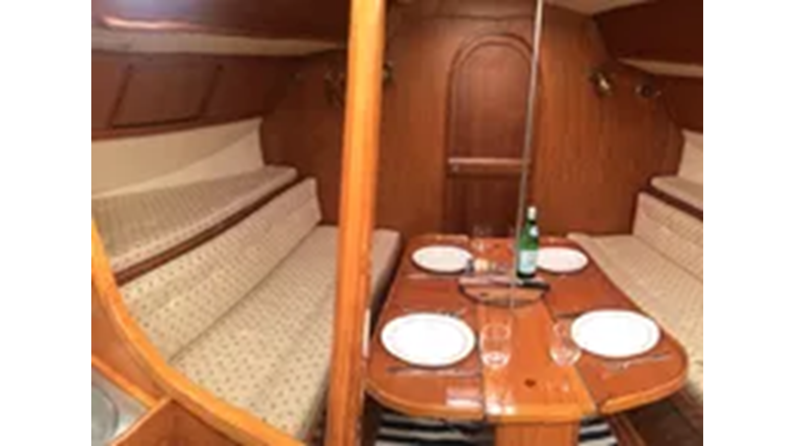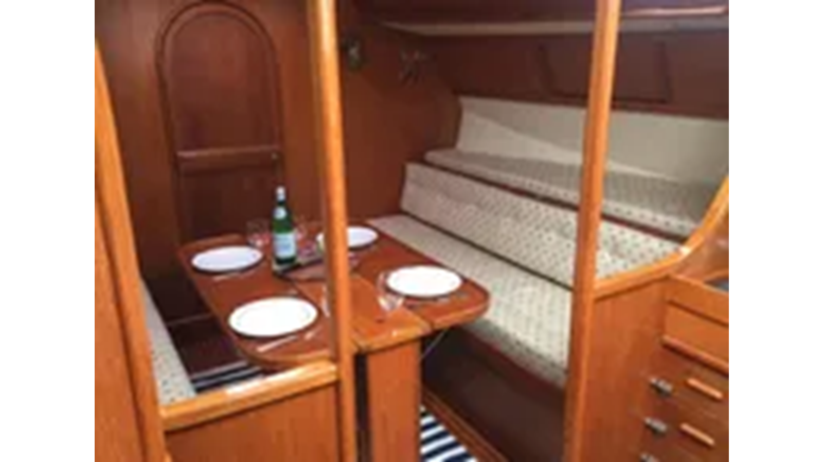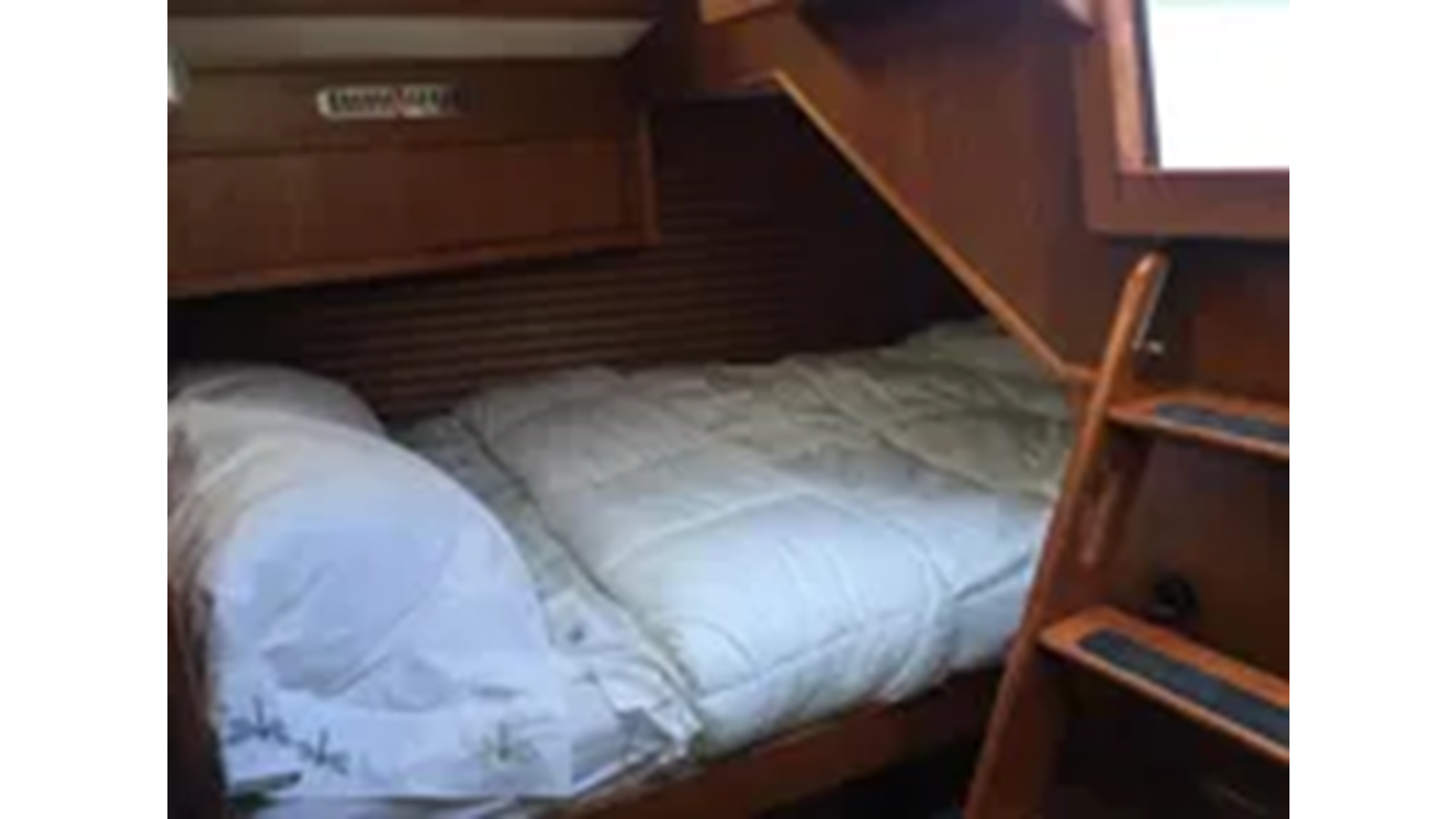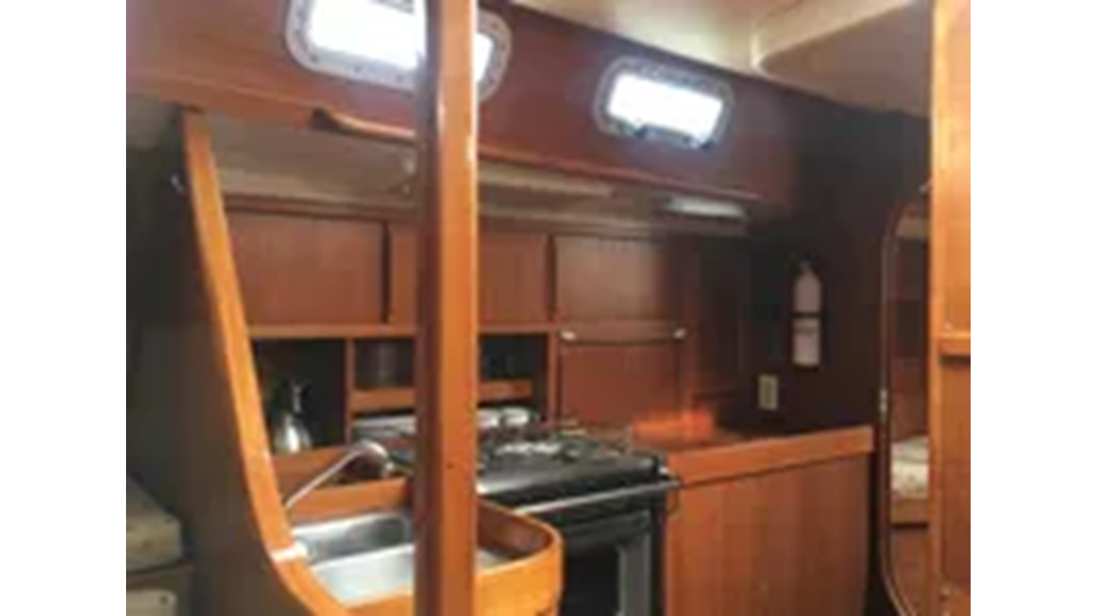 CRI CRI has a foreward cabin with a double berth to starboard. Access to the achor rode locker is through the forward bulkhead. There is a hanging locker to port and an overhead opening hatch. The salon has a settee portside and a full-sized, custom dinette to starboard. The mast step is through to the keel. The head is aft and starboard with a sink, toilet and shower. The galley is opposite the head with sinks, stove and fridge. In the aft cabin there are berths to port and starboard. The nav station is in the center of the aft cabin and is visible from the aft cockpit. Deck access is from the after companionway. Joinery through out is teak. Upholstery cream colored Ultra Suede. The hull is white awgrip finish.