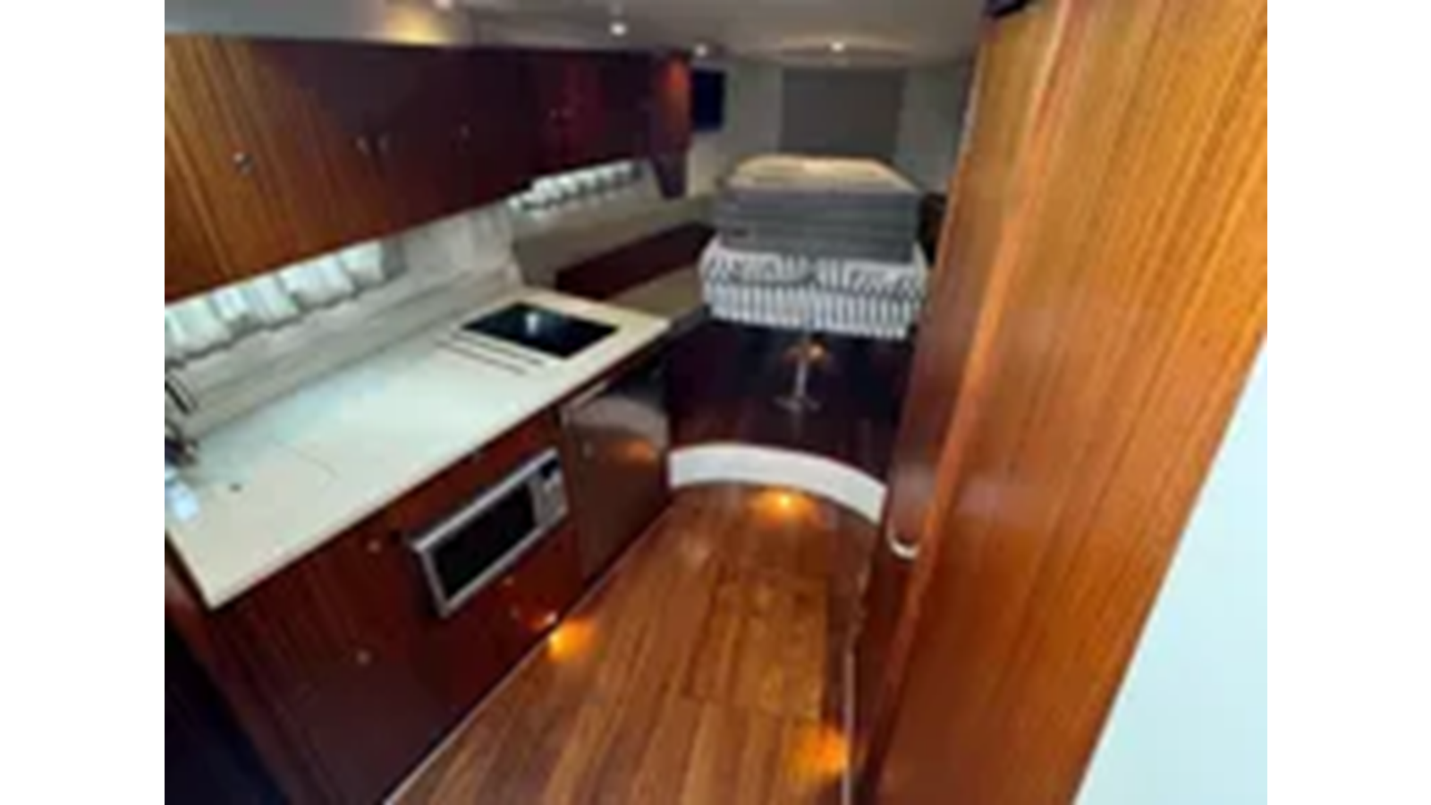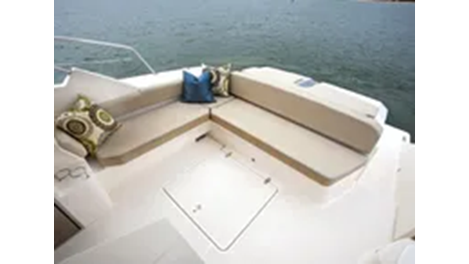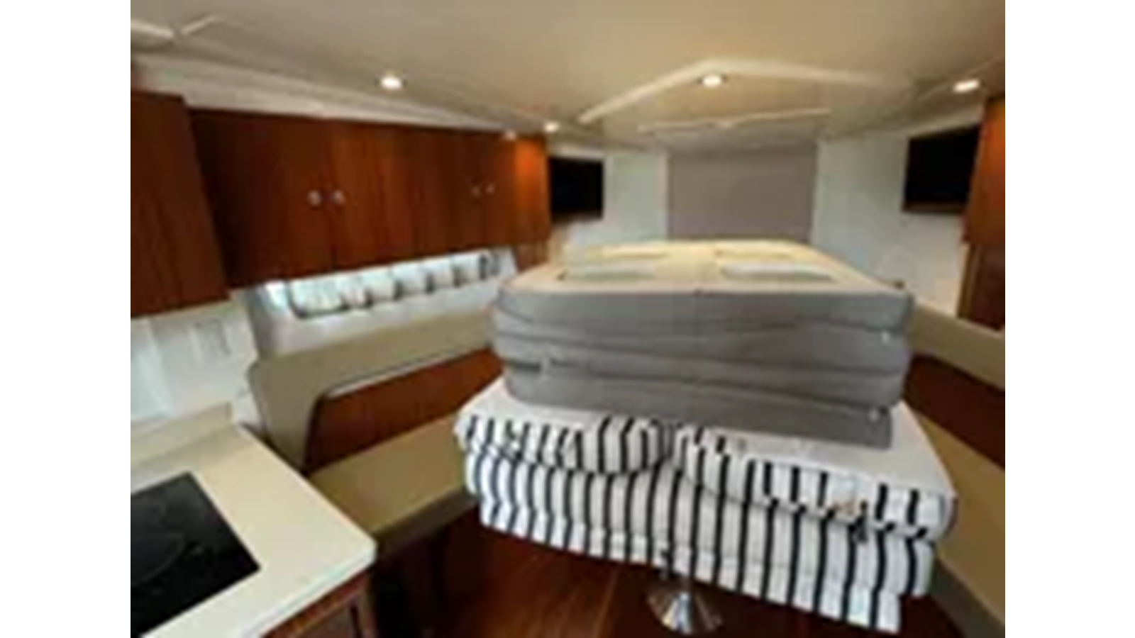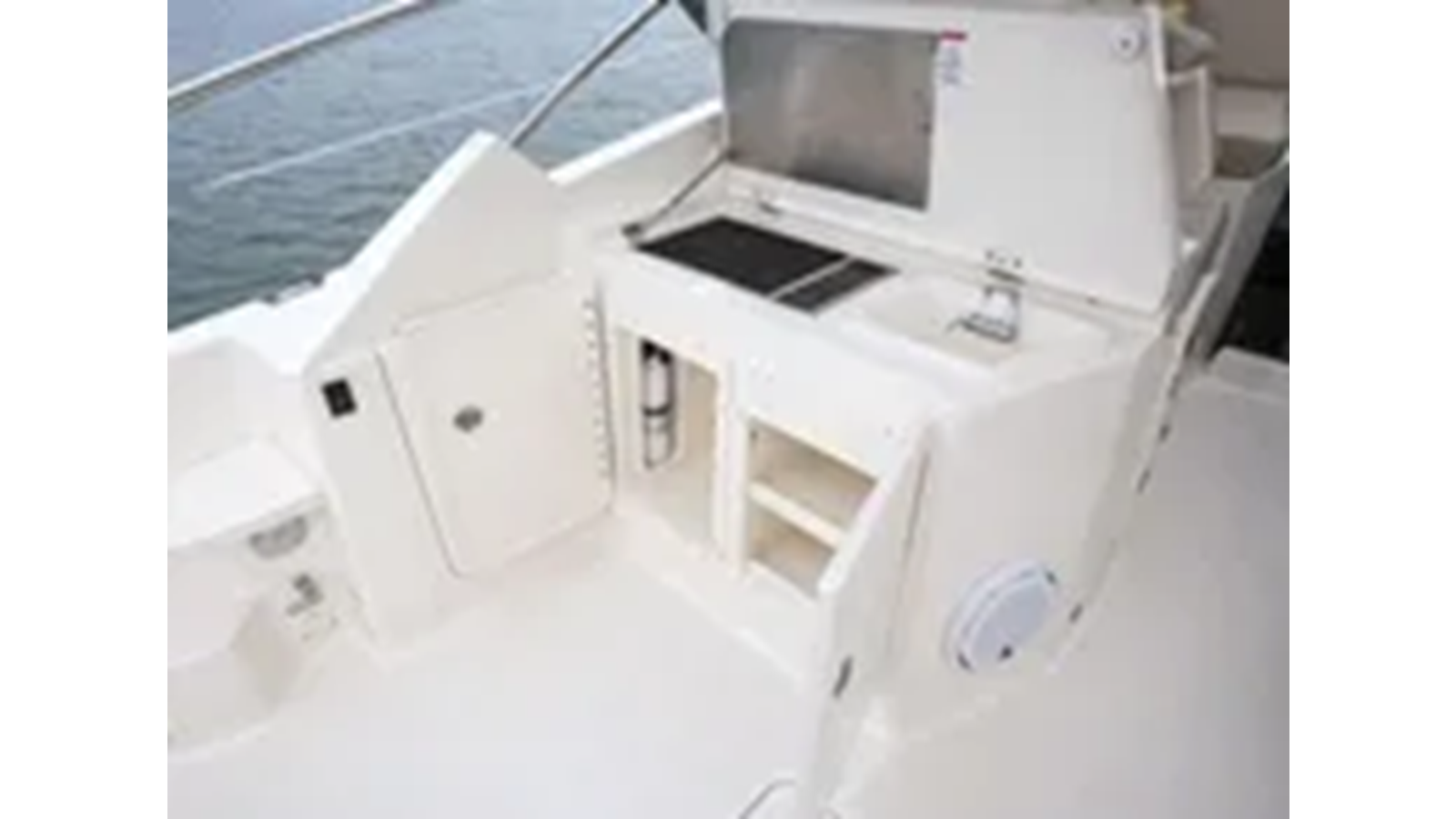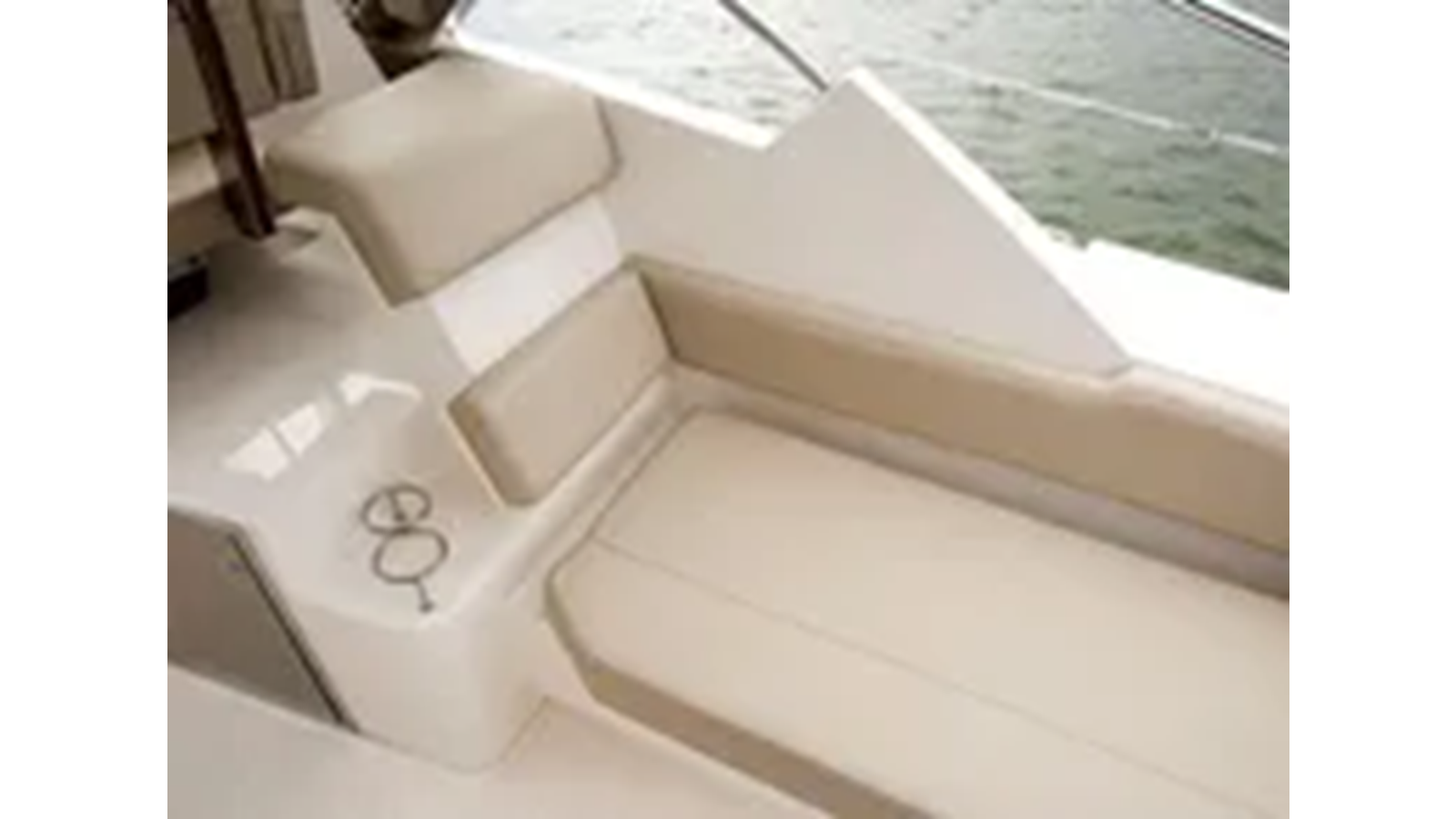 The oversized helm chair is complimented to the port side by a comfortable seating arrangement for passengers to share in the overall feel of the boat from the helm. The aft cockpit is highlighted by an extra large lounge, cushioned throughout for additional fun and entertaining. A fiberglass entertainment center conceals a sink with freshwater, electric grill and storage below. Within reach the stainless steel refrigerator keeps your refreshments cold and ready to serve.