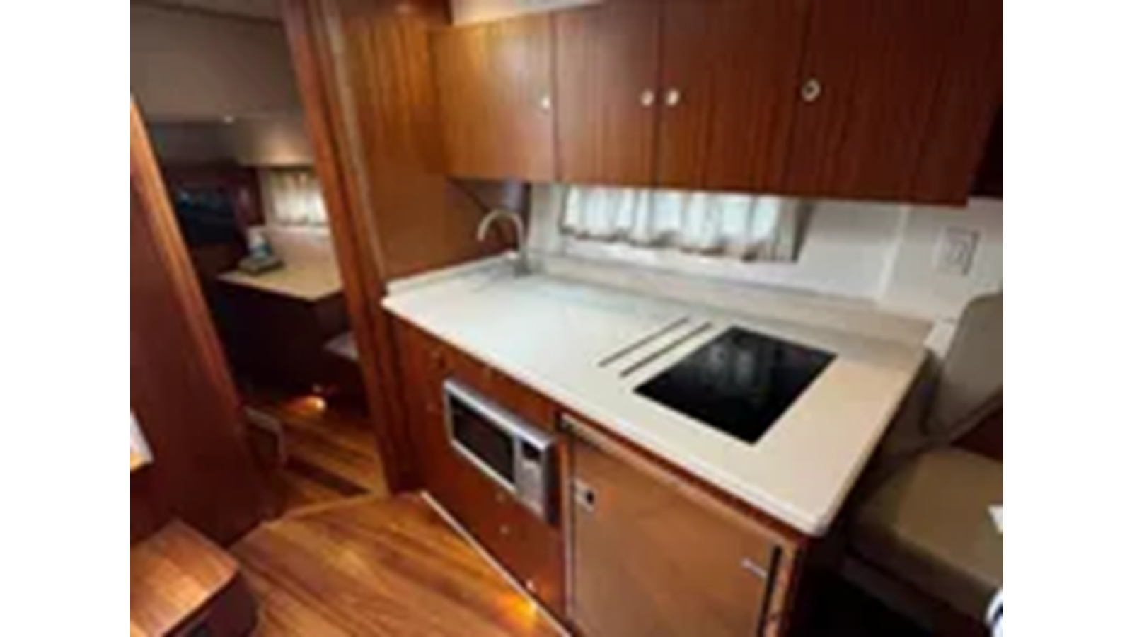 Natural light filtering through six hull side windows port and starboard and three deck windows overhead, adds to the openness of the cabin layout. A galley, head, convertible dinette and full beam midcabin are expertly engineered and appointed. The forward convertible dinette becomes an island berth when you pull each seat inboard. Add the single or twin bed arrangement in the midcabin and 4 adults can overnight in complete comfort.