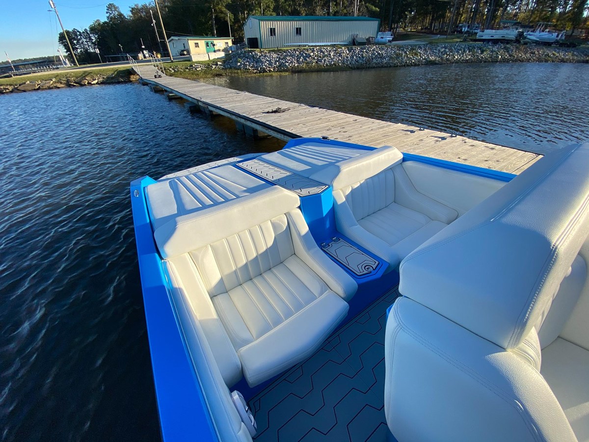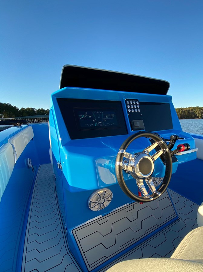 This boat was originally built in 2010 but stored indoors at the factory with very low hours until it was used to showcase some new design features and concepts as a prototype to new ideas for the brand. The boat is essentially brand new with complete fresh paint job, all new upholstery and seating configuration, SeaDek flooring throughout. The engines and drives are fresh water use only. The engines and drives currently have 45 original hours on them. The boat has a very modern / retro design aesthetic. Its very impressive looking and has a very notable presence on the water with the through hull exhaust and twin V8 power configuration. To duplicate this build as a brand new spec would be over 500K. Enjoy 70 plus MPH performance from one of the worlds most sought after boat brands at a fraction of the price.