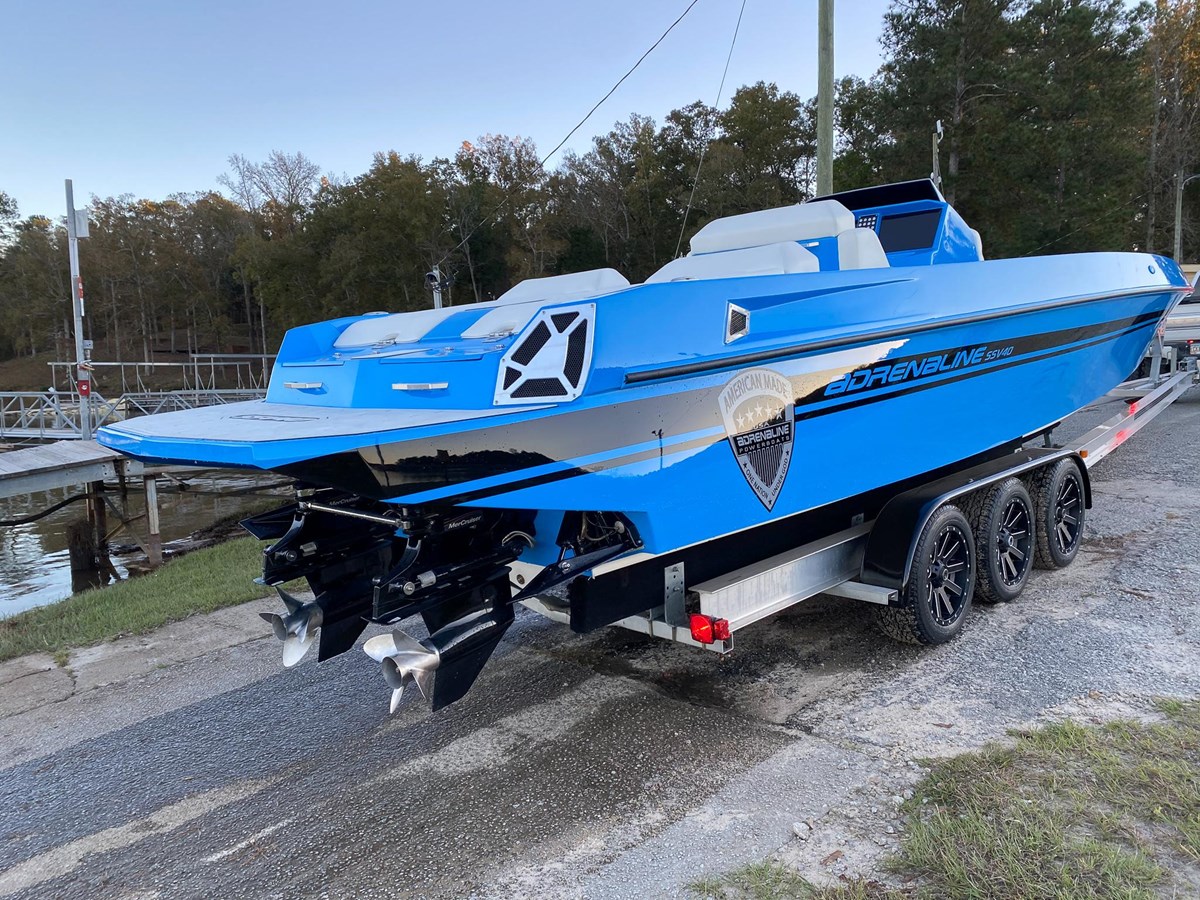 40 FT Performance center console with twin 496 MAG / Bravo outdrives. External Hydraulic Steering, 380 K planes, proprietary digital dashboard, front lounger with massive storage, Full V-berth Cabin with side lounger seating, Split rear seating, Sun pad engine cover, Huge integrated swim platform, Wet sounds stereo with led lighting and 3 x12” subwoofers. Full boat cover. Aluminum trailer included.