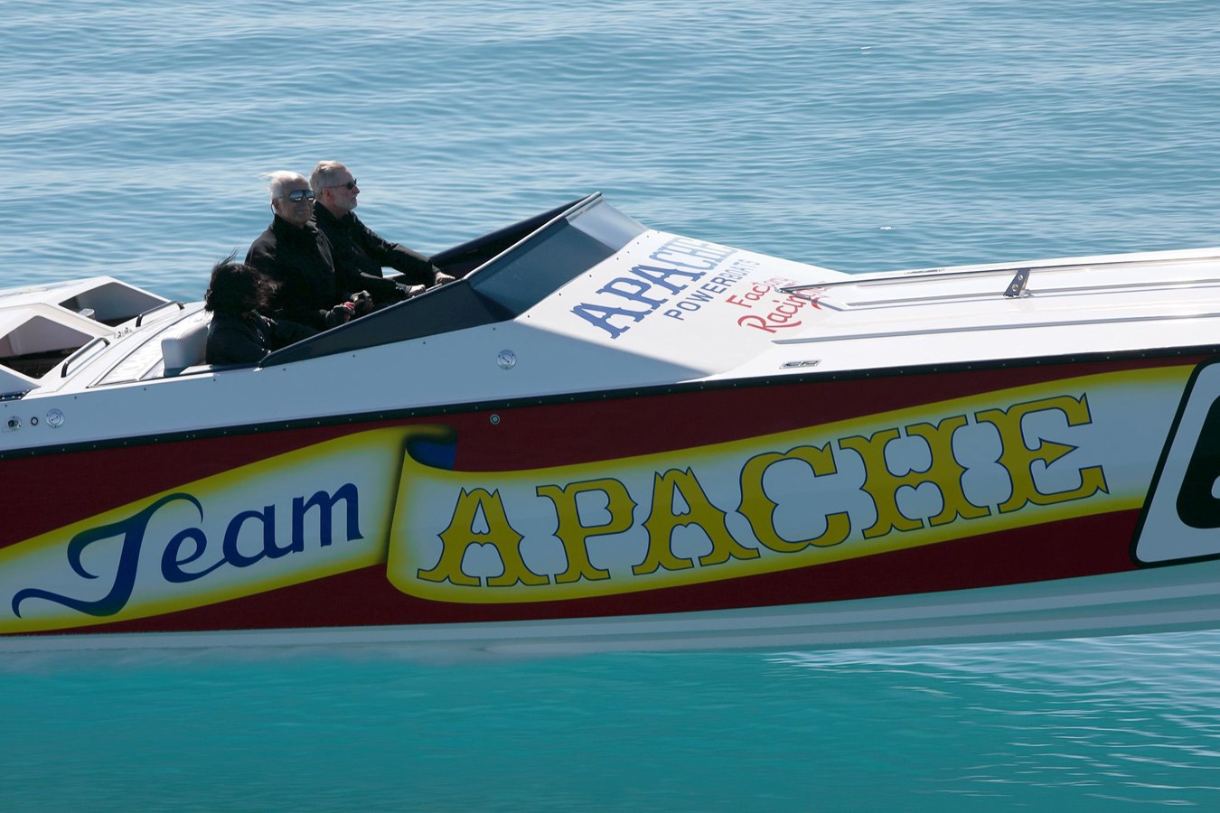 With the help of Bob Saccenti, the founder of Apache Powerboats the original painter of the boat, Gail Paik, was commissioned to repaint “Team Apache.” Paik, who worked extensively with the original Apache Racing team, painted the boat like the original and it is breathtaking work of art.