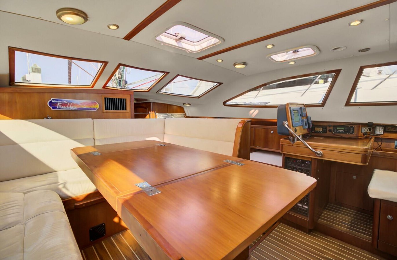 The chart table is to starboard and is raised to take advantage of the panoramic views. For additional details, see "Navigation and Electronics" below.