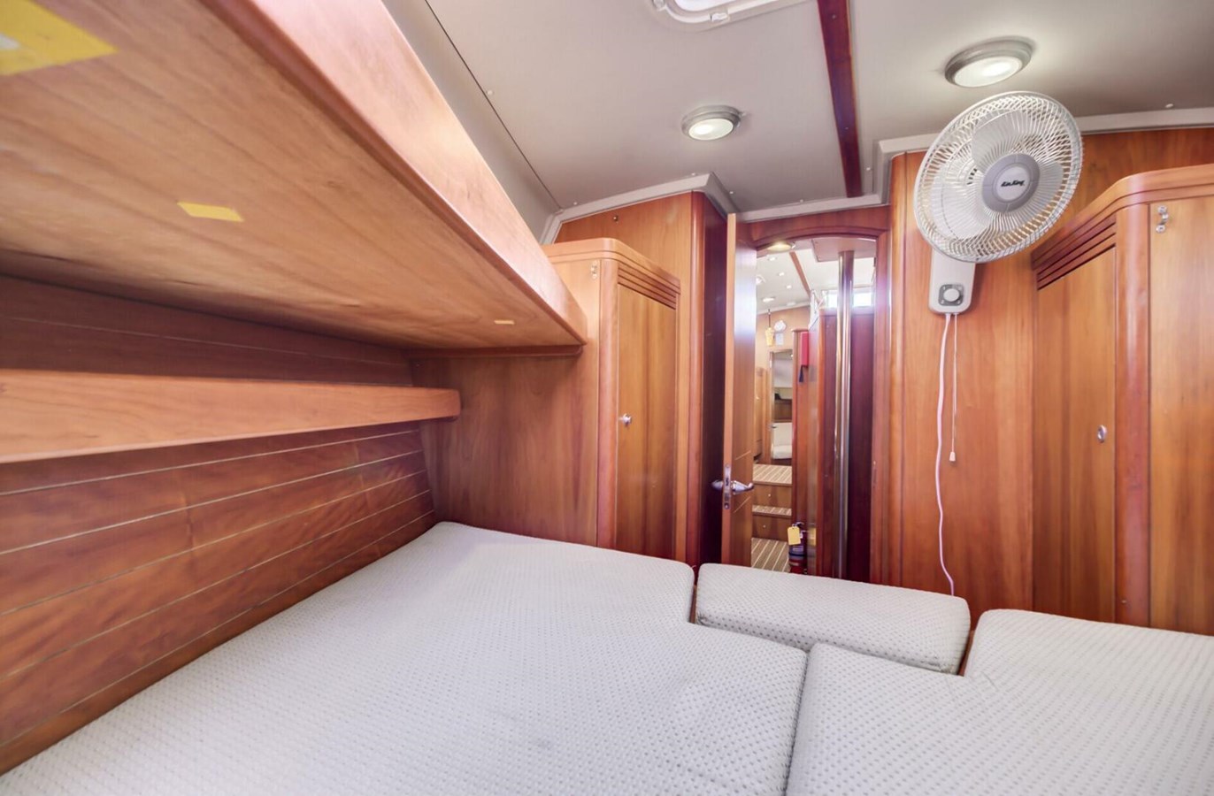 The third cabin is on the port side opposite the forward head. It has two single bunks and storage cabinets/lockers.