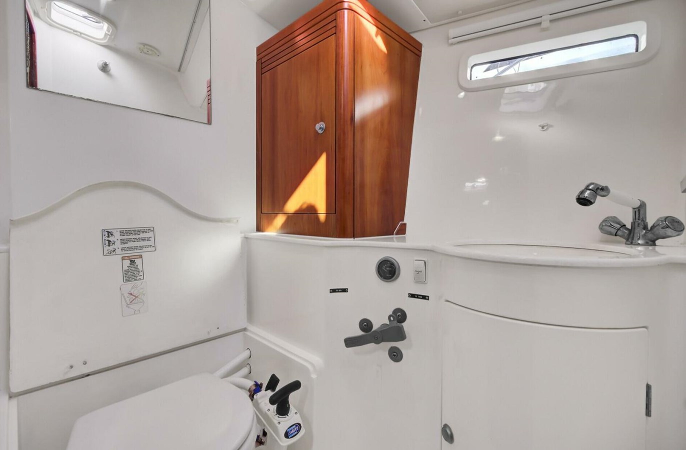 There are two heads. One is located on the starboard side forward of the galley, and the other is ensuite to Aft Cabin. A seat covers the head, allowing you to sit while showering. Both heads have an extractor fan. It is easy to keep clean and maintain with minimal wood in the head. Good storage is found under the sink and in outboard cupboards and lockers. Some additional head features include a manual Jabsco head, a large sink, a shower sump pump, hot and cold pressurized water with a mixer tap, and a waste tank gauge.