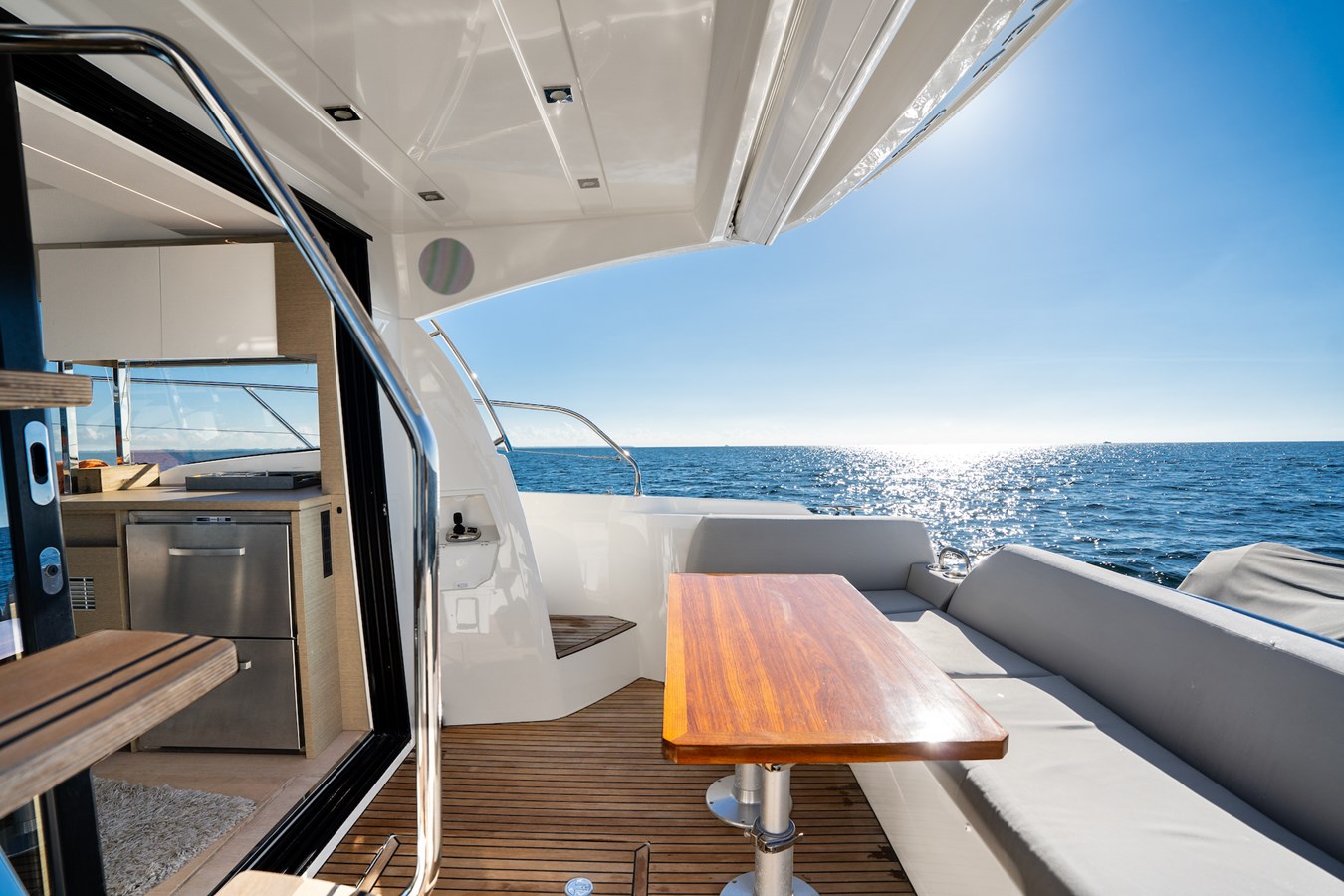 The Prestige experience is available starting at 42 feet, with the Prestige 420. Spacious and bright, enjoyable and high-performance, the Prestige 420 reflects the core values of the brand and offers an incredible quality of life aboard a boat of this size. Her bold, elegant lines are signatures of Garroni design. This model boasts a V-drive propulsion system that ensures perfect balance due to the centralisation of weight. This effective, high-performance solution enables unparalleled cruising.