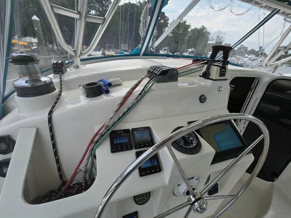 Storyteller's cockpit is one of the nicest I've seen. Great for entertaining, or passagemaking. The sling seat is brilliant. It's comfortable for you and your guests....and is just plain fun. Lots of storage compartments are underneath this area, as well.
