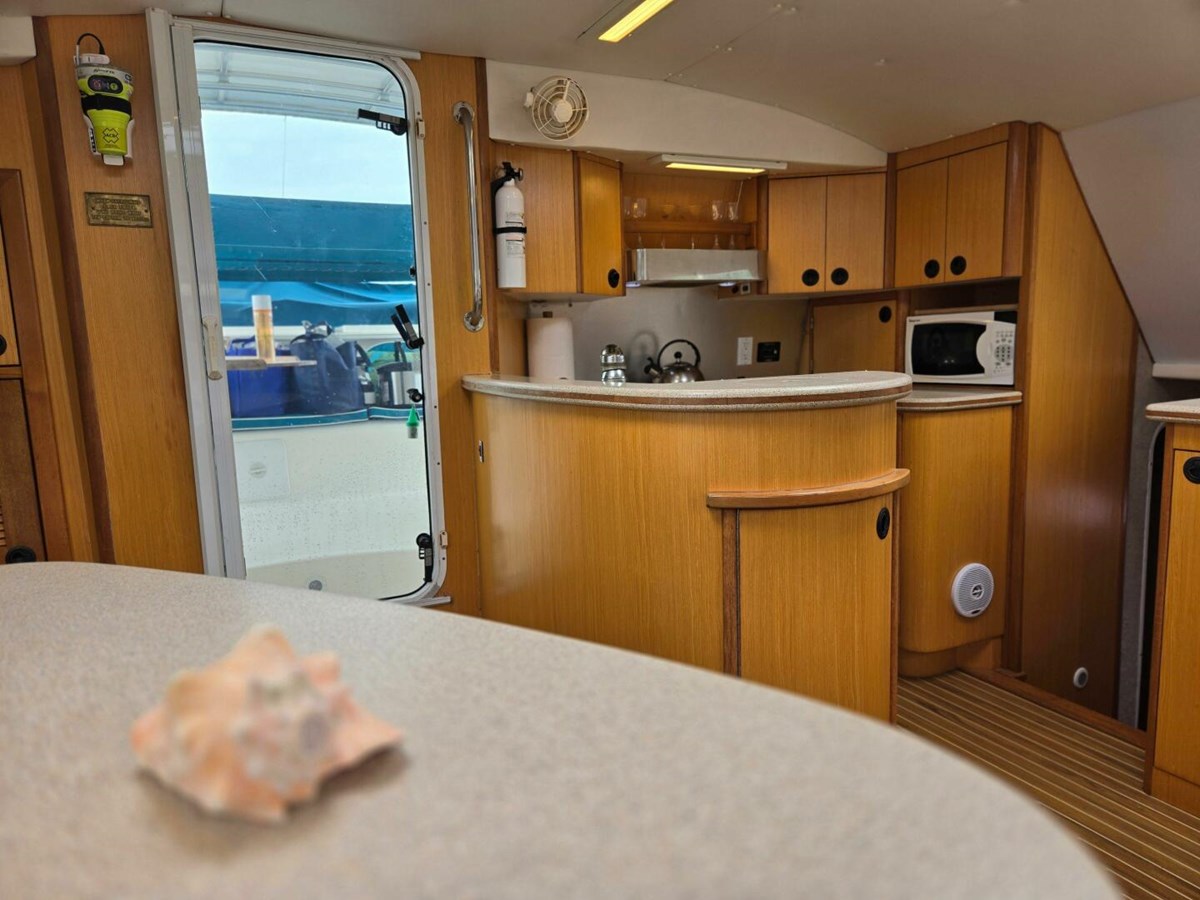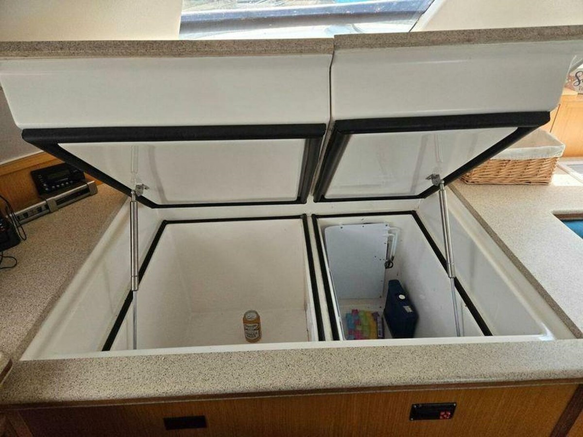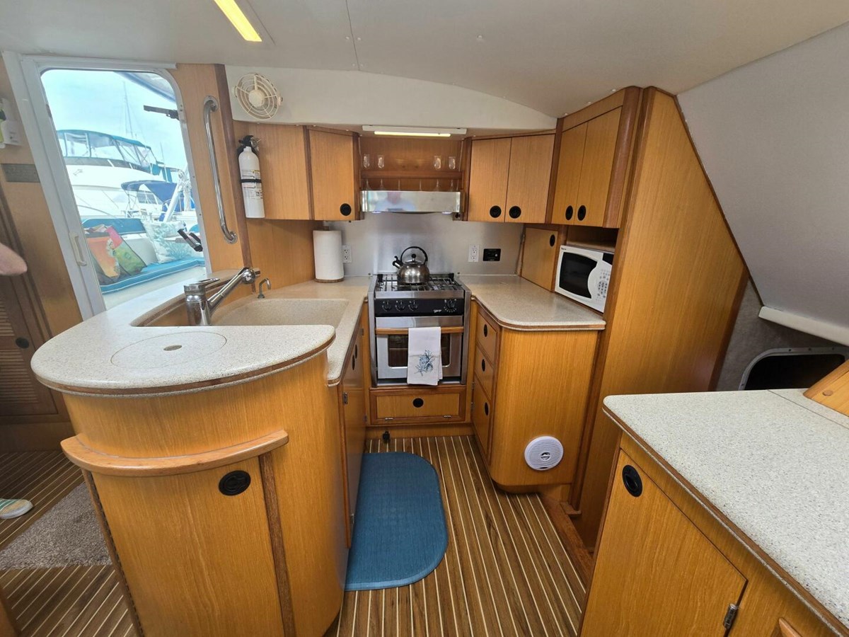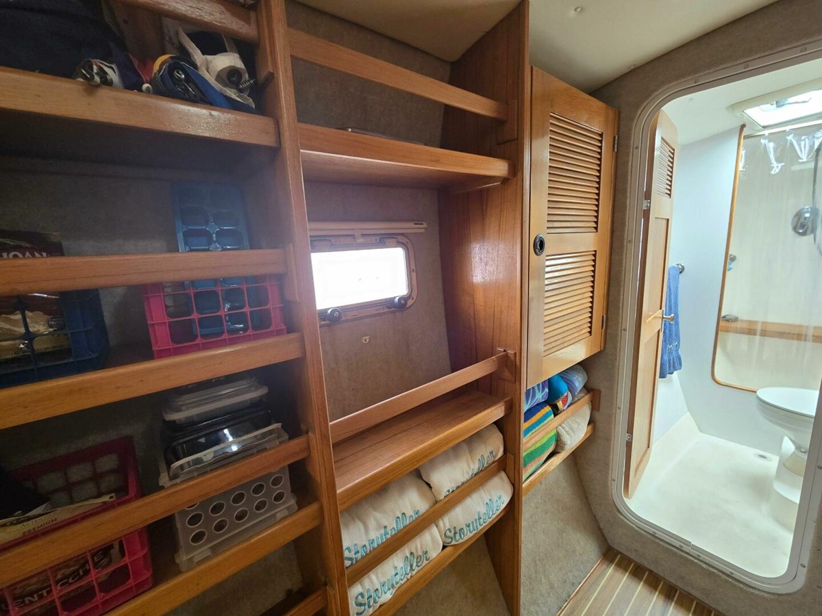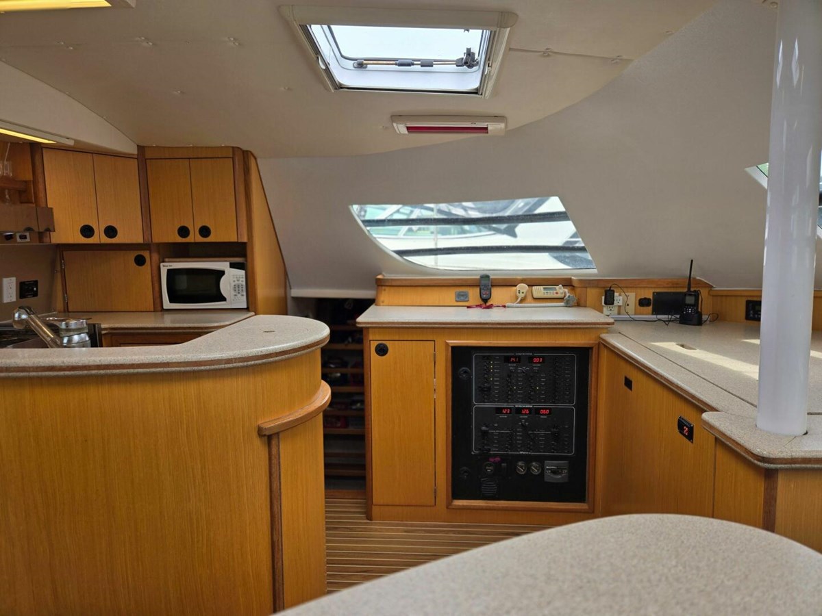 - A large pantry, multiple built-in bookcases and storage cabinets line the port hull companionway