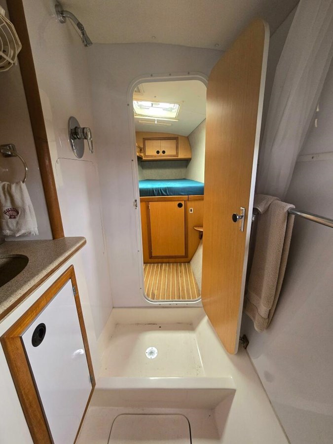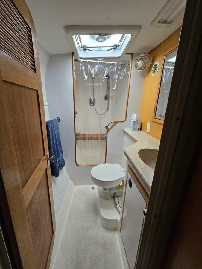 - The owner's head has a large medicine cabinet and wooden shower seat, one opening Bomar port and a Bomar hatch, both with screens and Oceanair shades