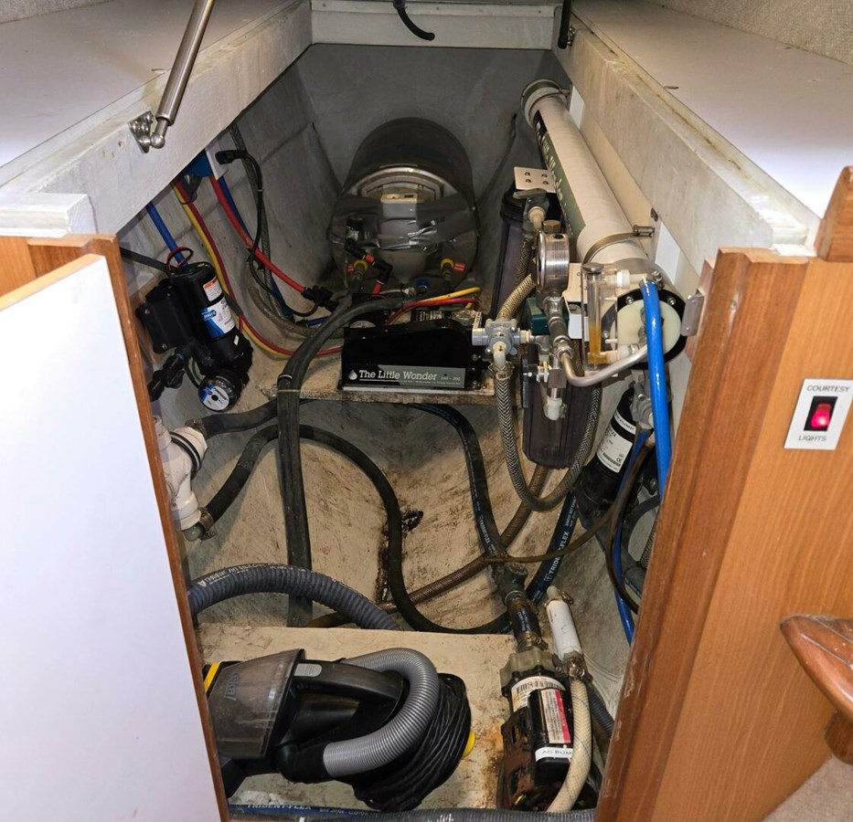 - Thru-hull fittings and sea cocks are all non-corrosive Marelon, except engine raw water intakes of brass.