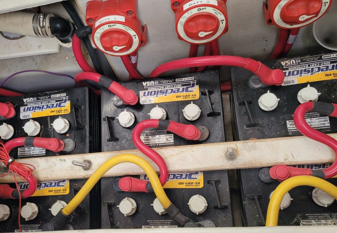 - 6 x 6V flooded cell house batteries in series-parallel (3 12V banks)