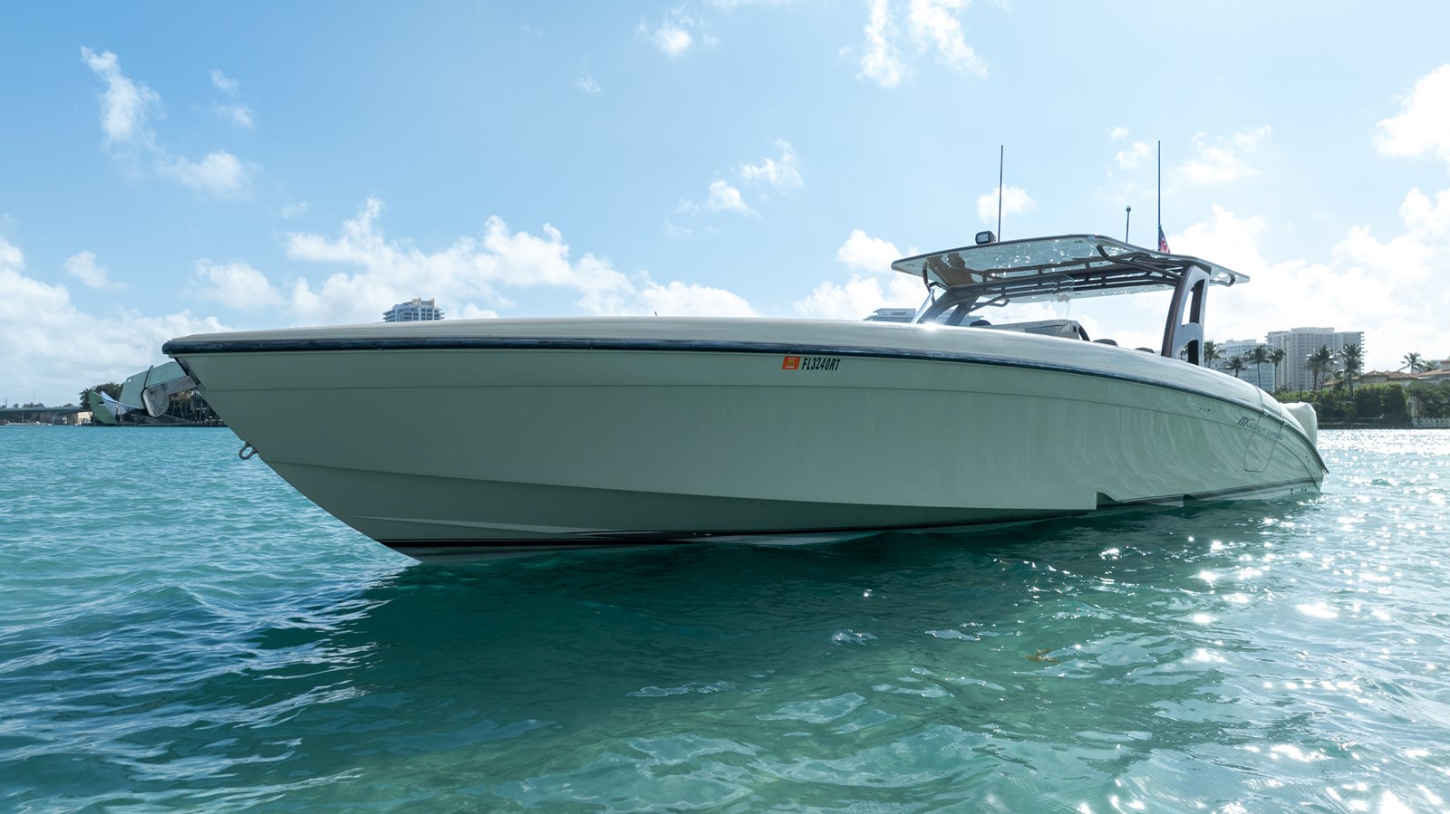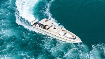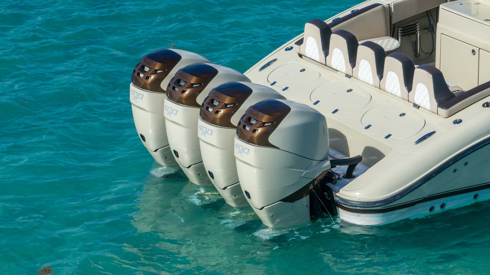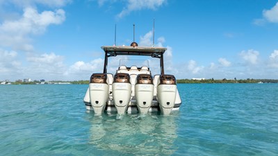 Powered by quad Mercury Verado 400R outboards (1,600+ HP total), offering impressive acceleration and cruising performance.