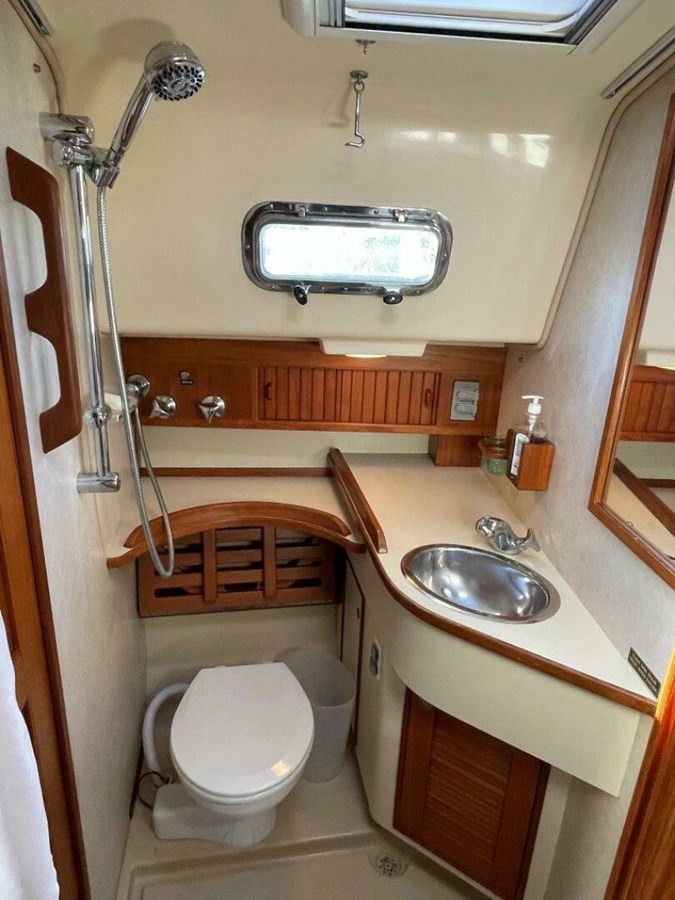 The private aft cabin, with direct access to the aft head, has a large double berth, cedar-lined hanging locker, bureau, and bookshelf. The aft head is accessible from the salon and aft cabin. It has a sink vanity with cabinets over and under, a wraparound shower with a curtain, and a teak fold-down seat.