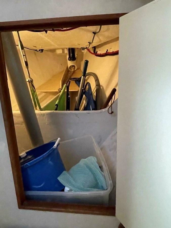 The forward cabin spans the boat's full beam and has a very nice private head with a dedicated shower. The comfortable offset double bed is accessible from both sides, so you don’t have to climb over your partner. The bottom of the bed is hinged and easily lifts with the support of gas struts to reveal a large storage area. There are shelves, cabinets, bureaus, drawers, a cedar-lined hanging locker, and a seat.