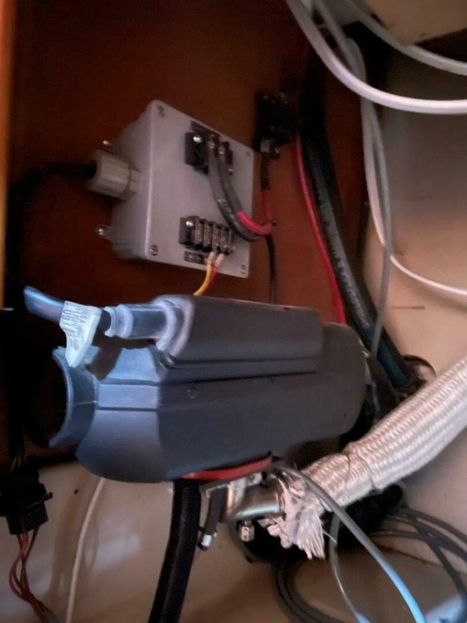 - A 12-volt submersible bilge pump and a float switch are installed in the deep bilge sump below the salon sole.