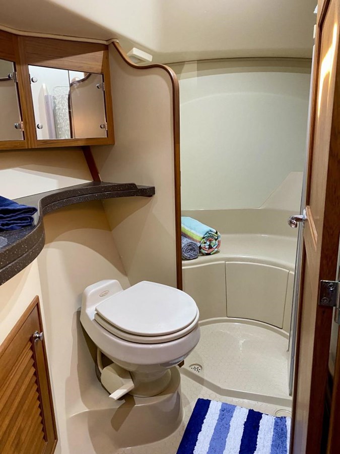 The forward owner's stateroom spans the beam of the yacht and includes a generous offset island berth with access on both sides, so you don't have to disturb your partner when getting out of bed. The berth is hinged and can be raised on gas support struts to reveal ample storage. There is a cedar-lined hanging locker and teak bureau. A nice dressing seat to port adds a final touch. The master also has Samsung TV with Mast mounted GloMax antenna. A luxurious private head is located adjacent to the stateroom and features a large stall shower with folding acrylic doors, Vacuflush toilet, vanity w/ acrylic countertop and molded sink. Mirrored storage cabinets and large drawers finish this impressive head.