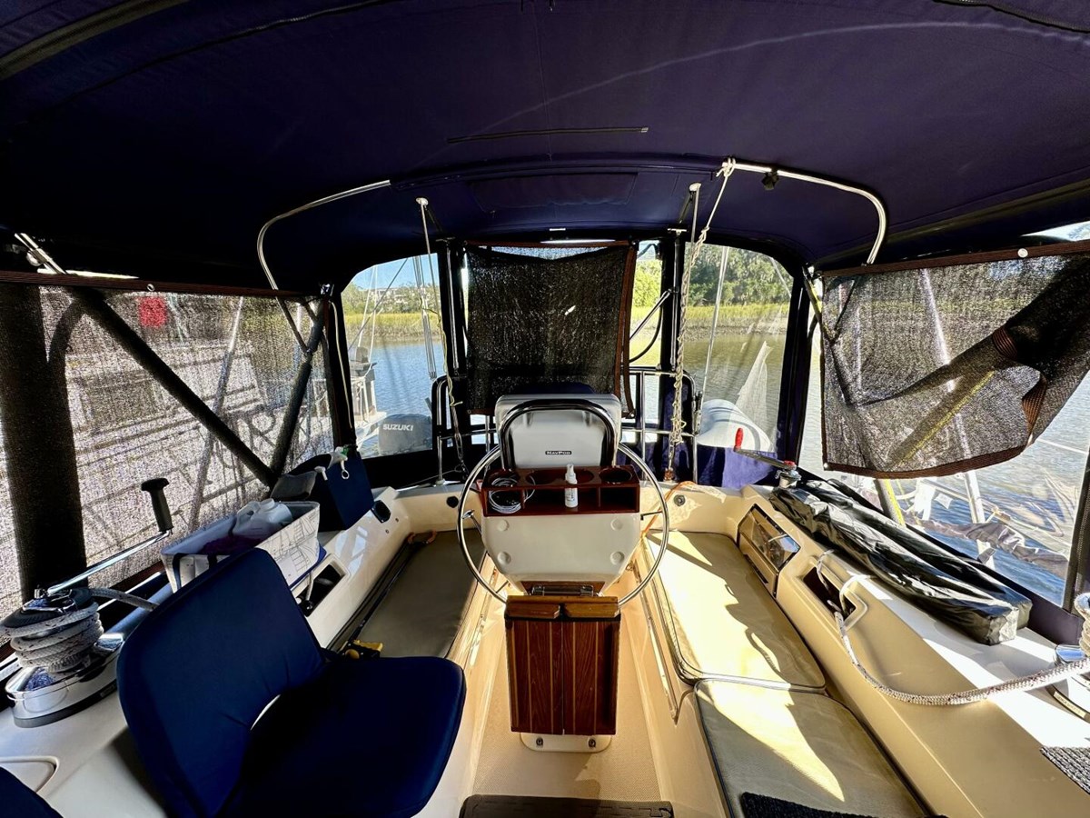 The roomy cockpit is safe and comfortable with brand newer Bimini/dodger. The large swim platform features twin molded-in steps to port and starboard, a hot/cold shower and a fold-out swim ladder. Full length, ergonomically shaped cockpit seats w/ full cushions, dual deep seat lockers, line storage bins, extra wide coamings with numerous storage bins, four harness pad eyes, two 2' cockpit scuppers, engine panel adjacent to helm in covered alcove.