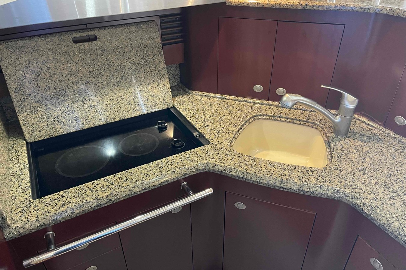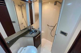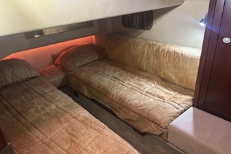 The Sea Ray 420 Sedan Bridge (called 44 Sedan Bridge in 2006–09) combines the bold, cutting-edge styling and lush accommodations boating enthusiasts have come to expect in late-model Sea Ray yachts. By any standard, the 420 is a strikingly handsome design both inside and out. Wood floors, oversized windows, and plush Ultra leather sofas are just a few of the luxuries found in the spacious cabin. A raised dining area provides a panoramic view of the outdoors, and deep-pile carpeting and high-gloss cherry cabinets highlight the decor. Below, a small guest cabin to port has twin single beds, while the forward master stateroom features a queen-size island berth with lots of storage in drawers and closet space. A Splendid combo washer/dryer unit is hidden under the galley stairs. Both head compartments are fitted with shower stalls. A sliding glass door opens to the cockpit with its walk-through transom, transom bench seat, and molded flybridge stairs. Offering good visibility fore and aft, the extended flybridge includes a large U-shaped aft seat with removable table. Cummins 6CTA 8.3 430hp diesels cruise the 420 Sedan Bridge in the mid 20s and reach about 30 knots top.