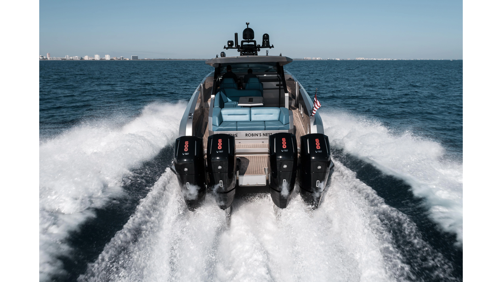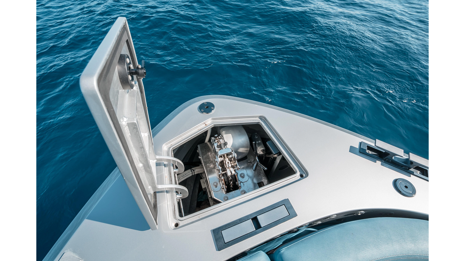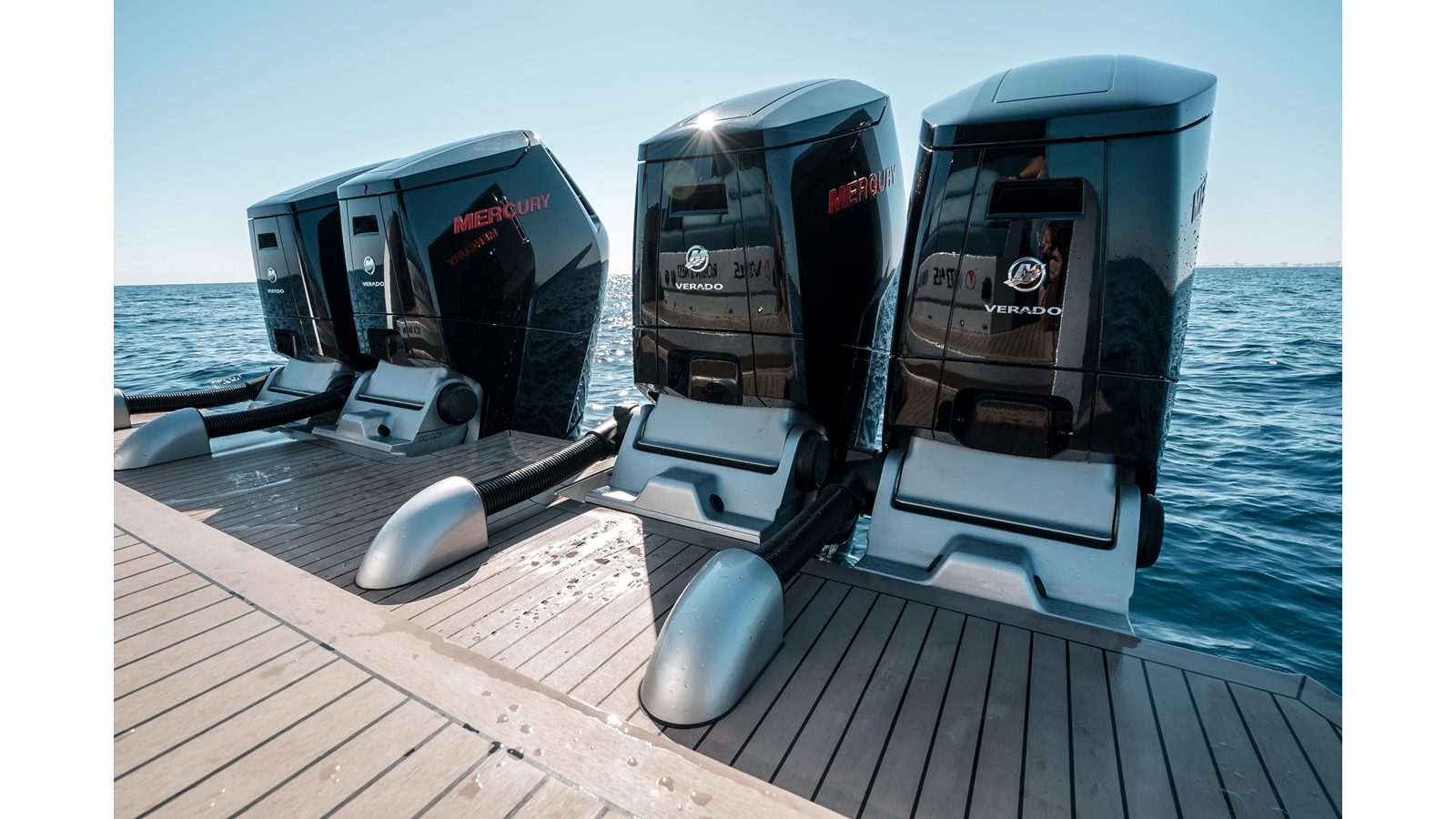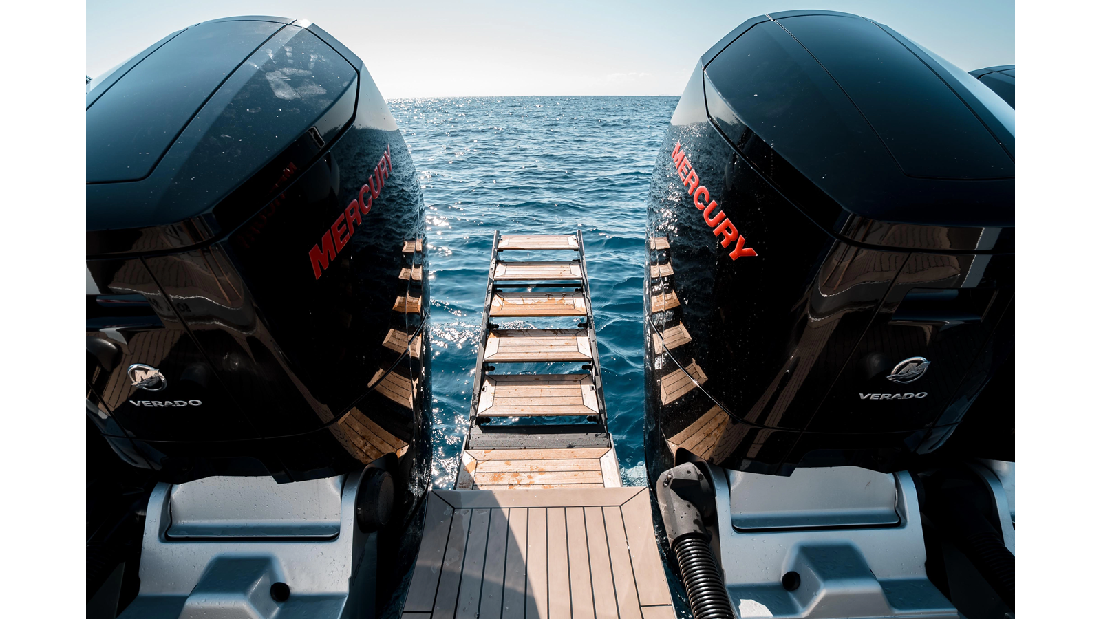 The quad Mercury V10 600HP outboards provide excessive performance, hole shot, and a top speed of over 60 knots. The joystick (with skyhook) and bow thruster make maneuvering in tight spaces effortless, while the SeaKeeper 6 and ZipWake automatic interceptor tabs add stability both at speed and rest.