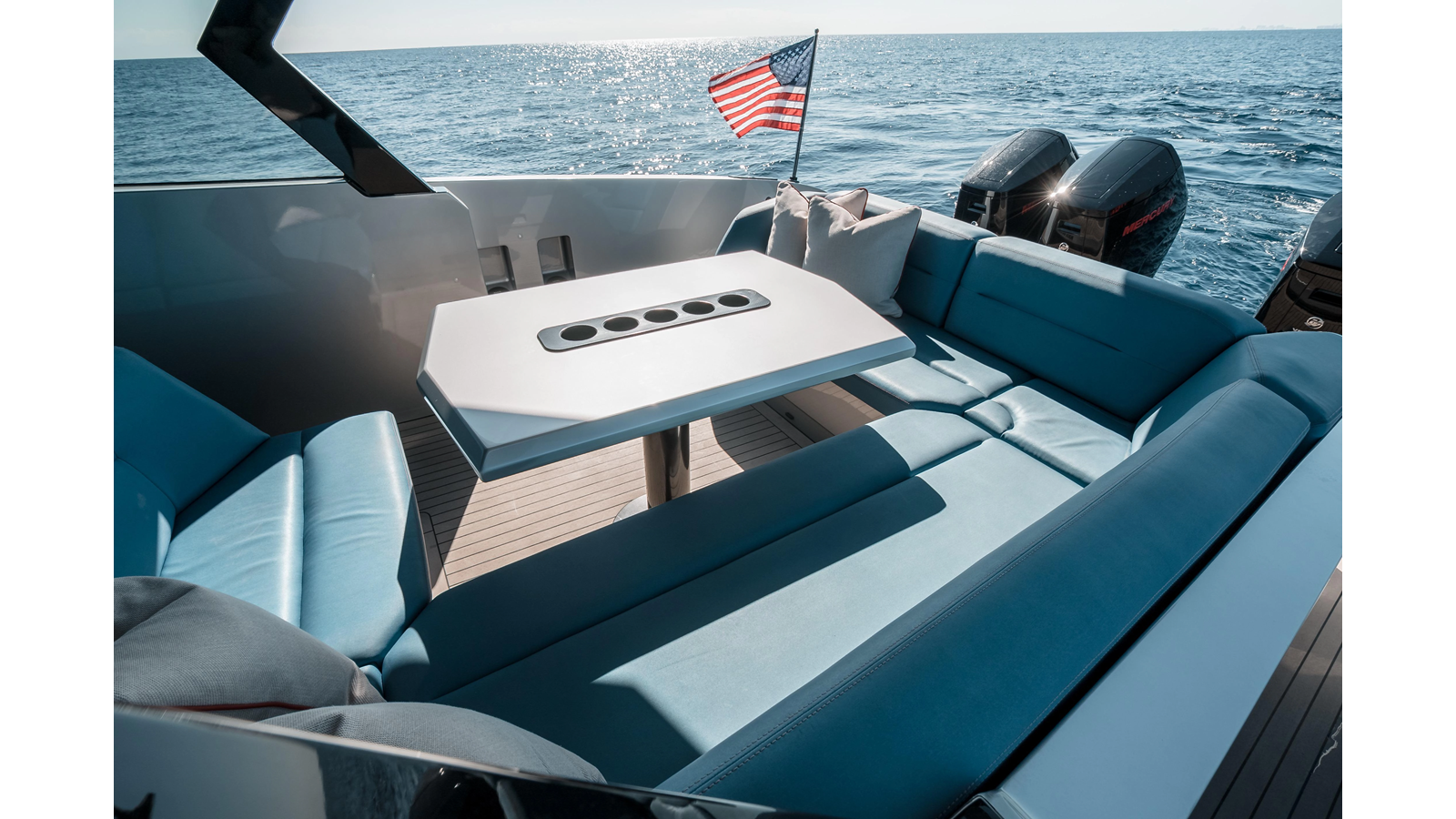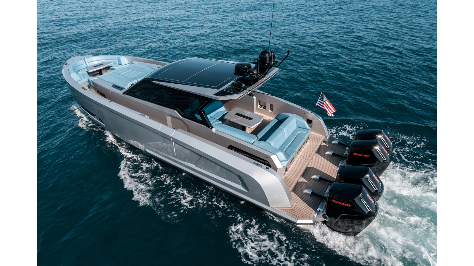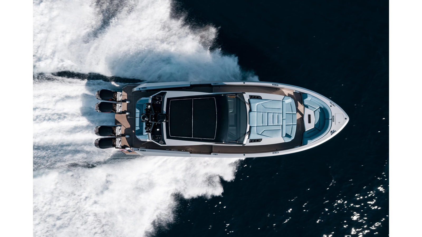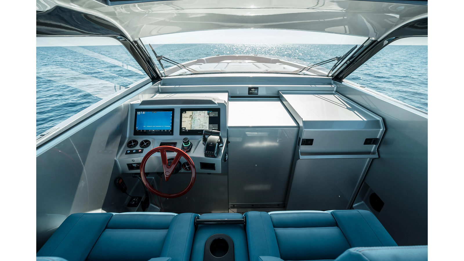 The quad Mercury V10 600HP outboards provide excessive performance, hole shot, and a top speed of over 60 knots. The joystick (with skyhook) and bow thruster make maneuvering in tight spaces effortless, while the SeaKeeper 6 and ZipWake automatic interceptor tabs add stability both at speed and rest.