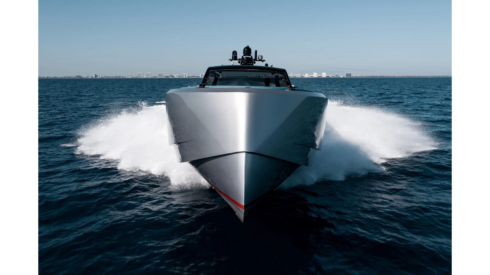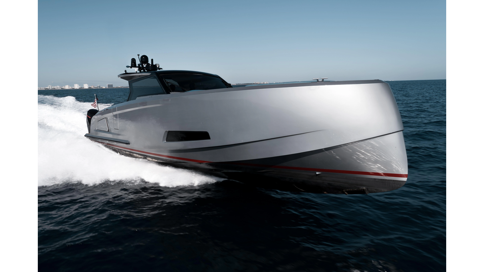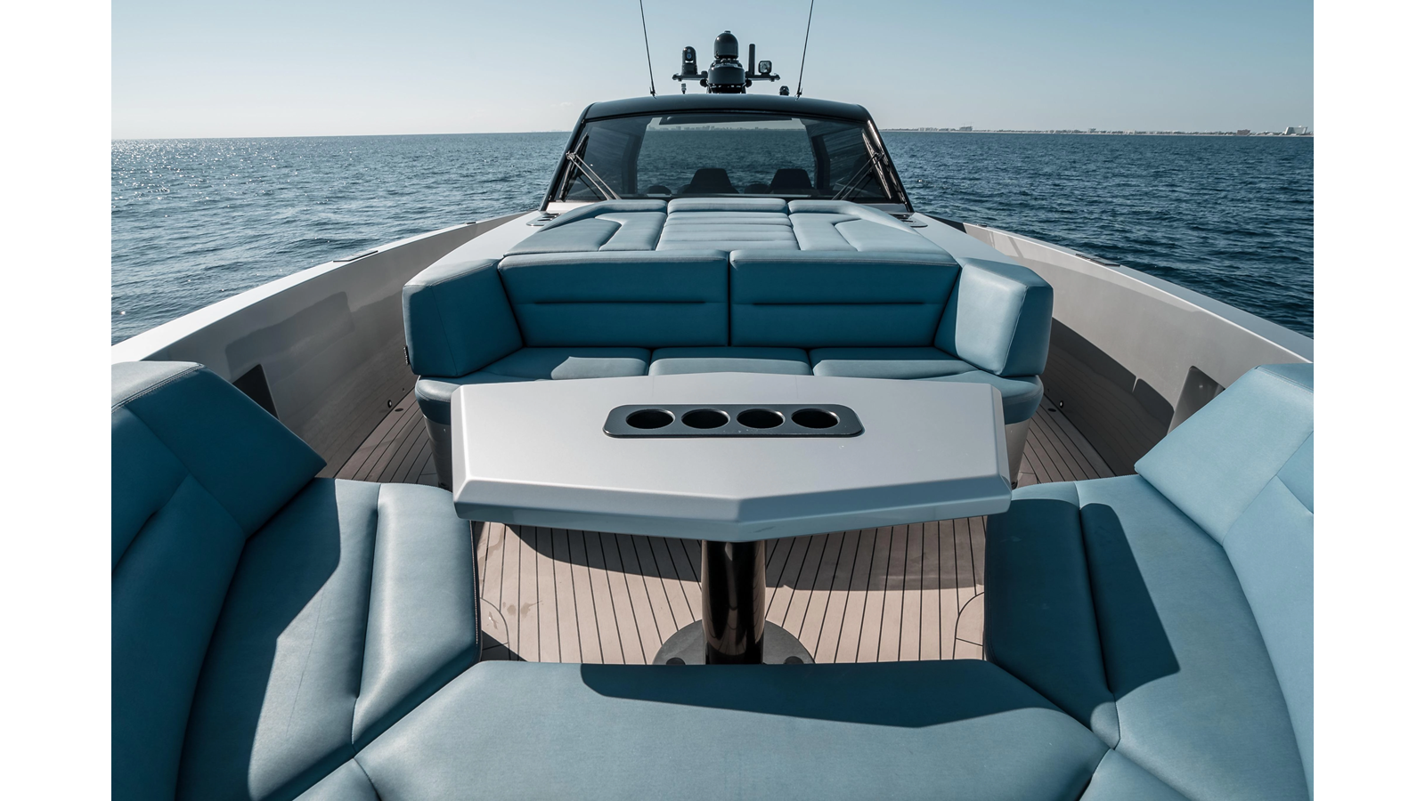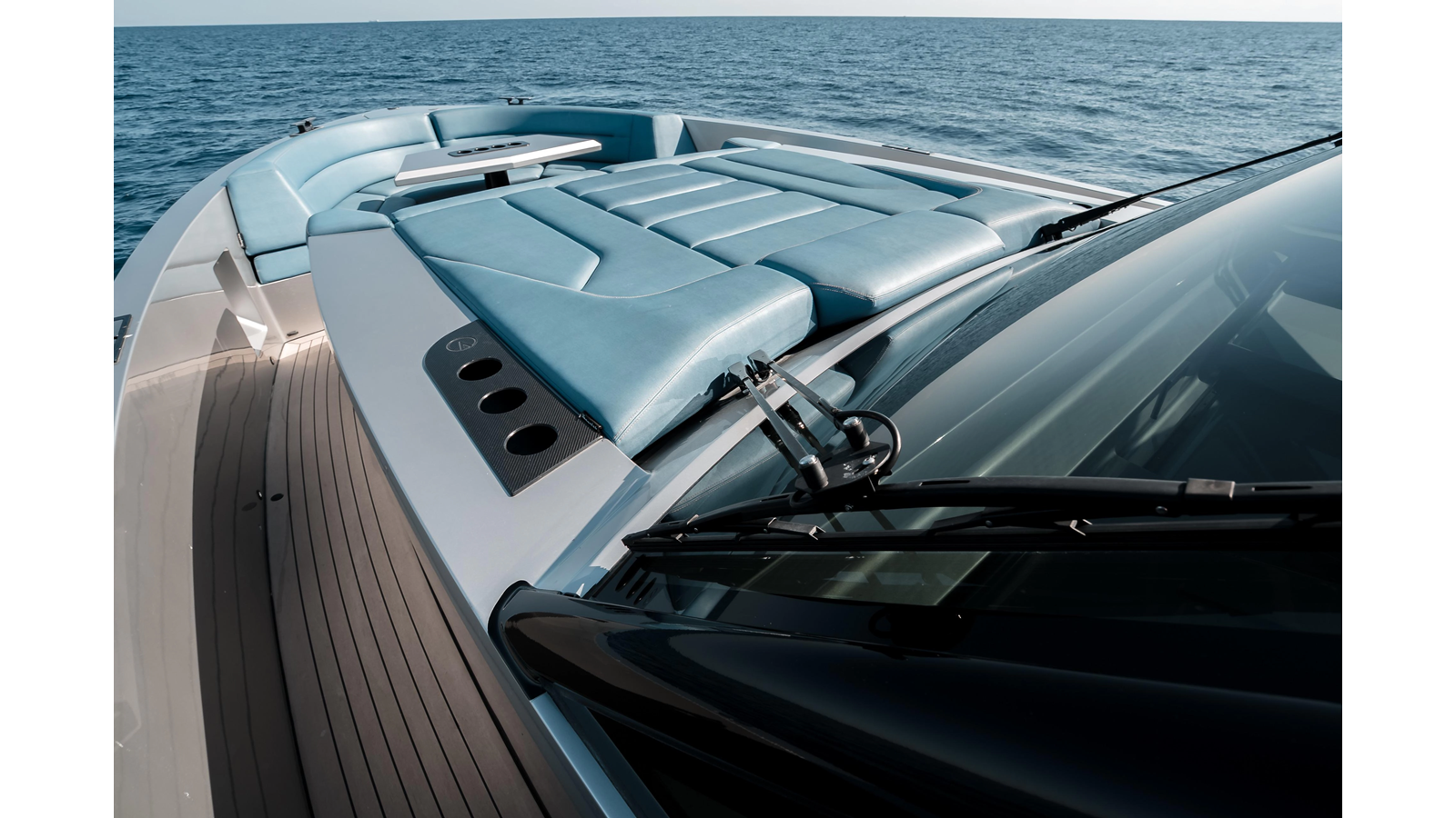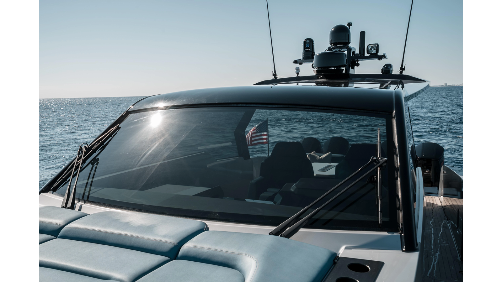 The quad Mercury V10 600HP outboards provide excessive performance, hole shot, and a top speed of over 60 knots. The joystick (with skyhook) and bow thruster make maneuvering in tight spaces effortless, while the SeaKeeper 6 and ZipWake automatic interceptor tabs add stability both at speed and rest.