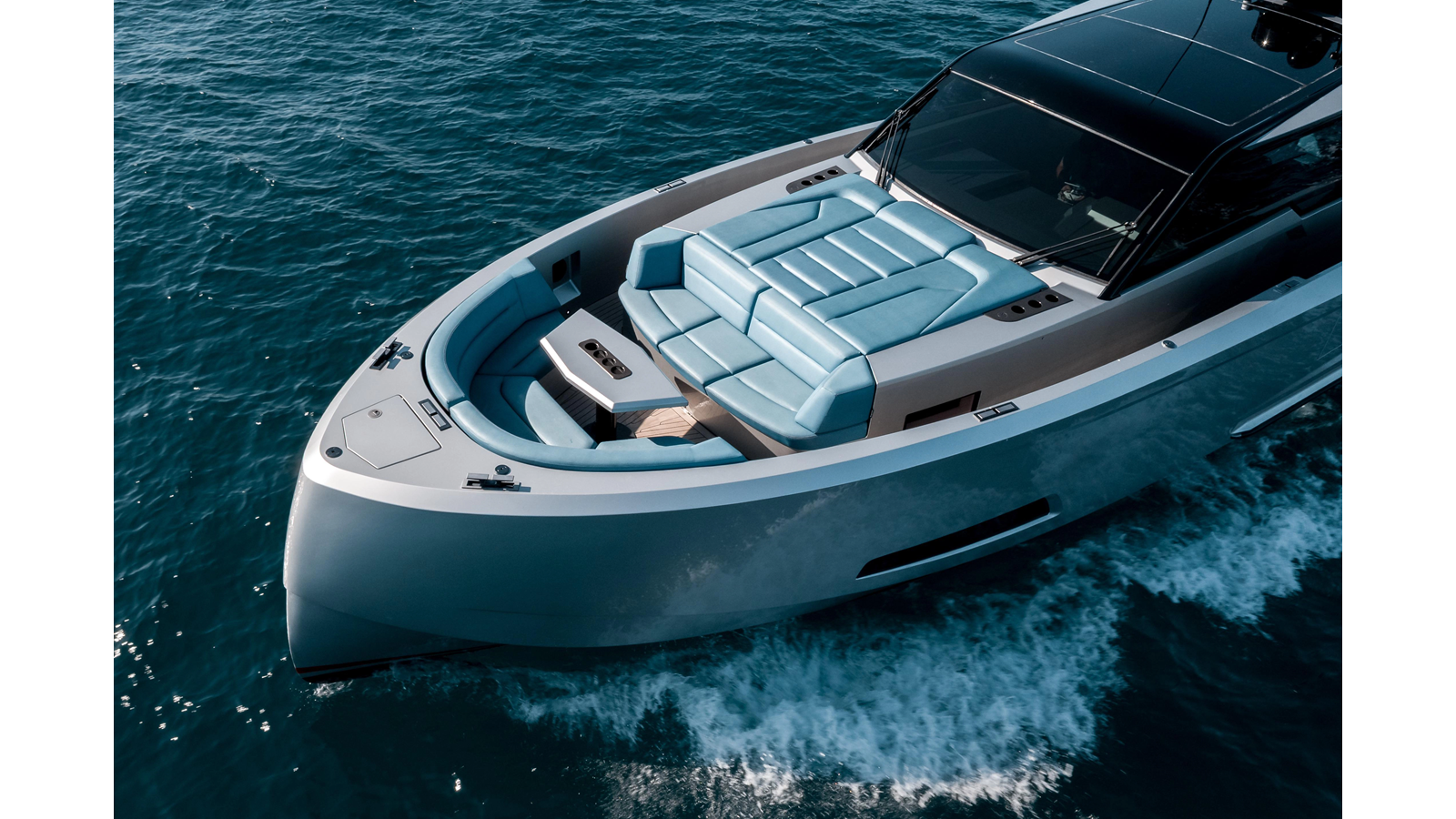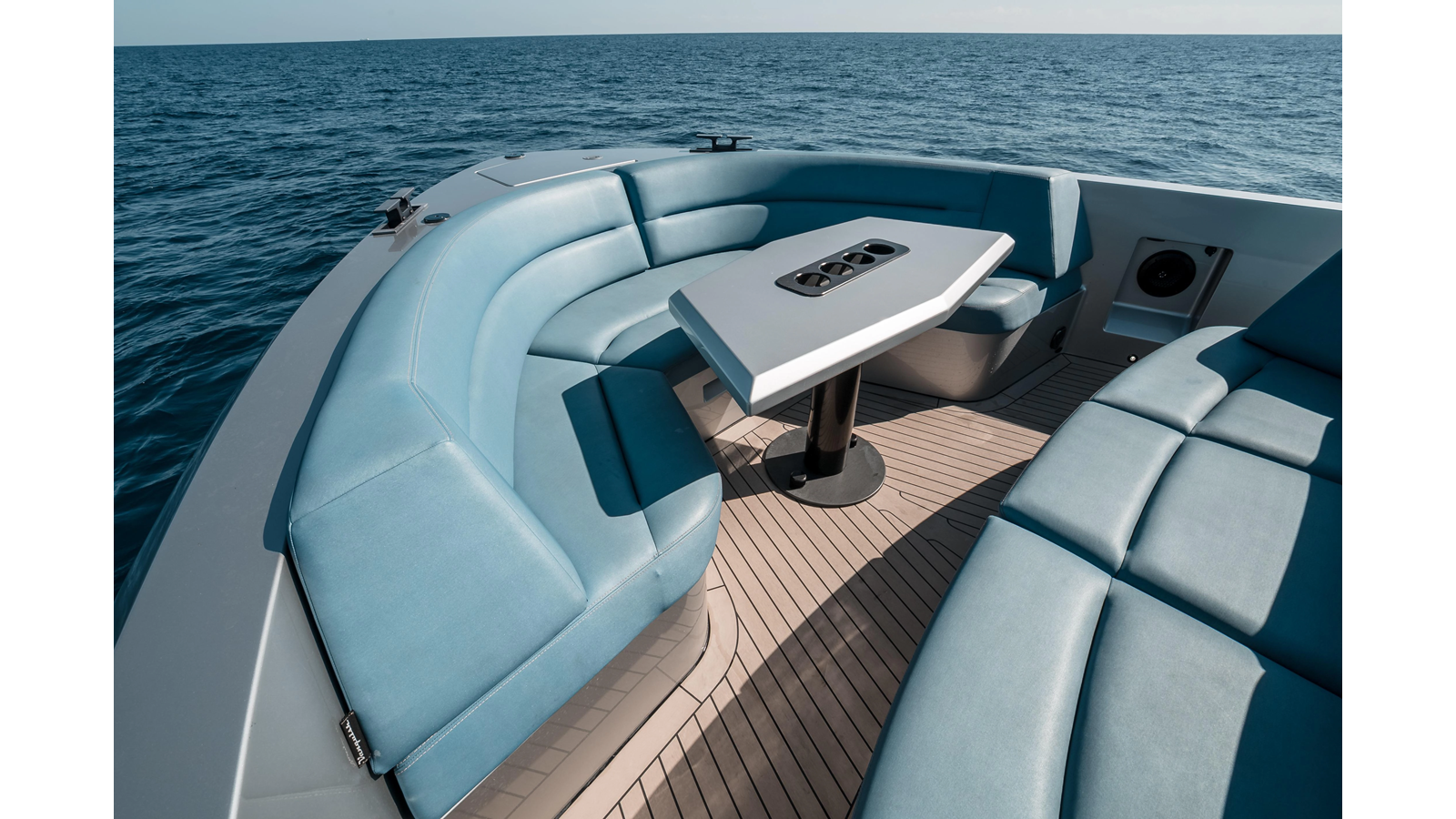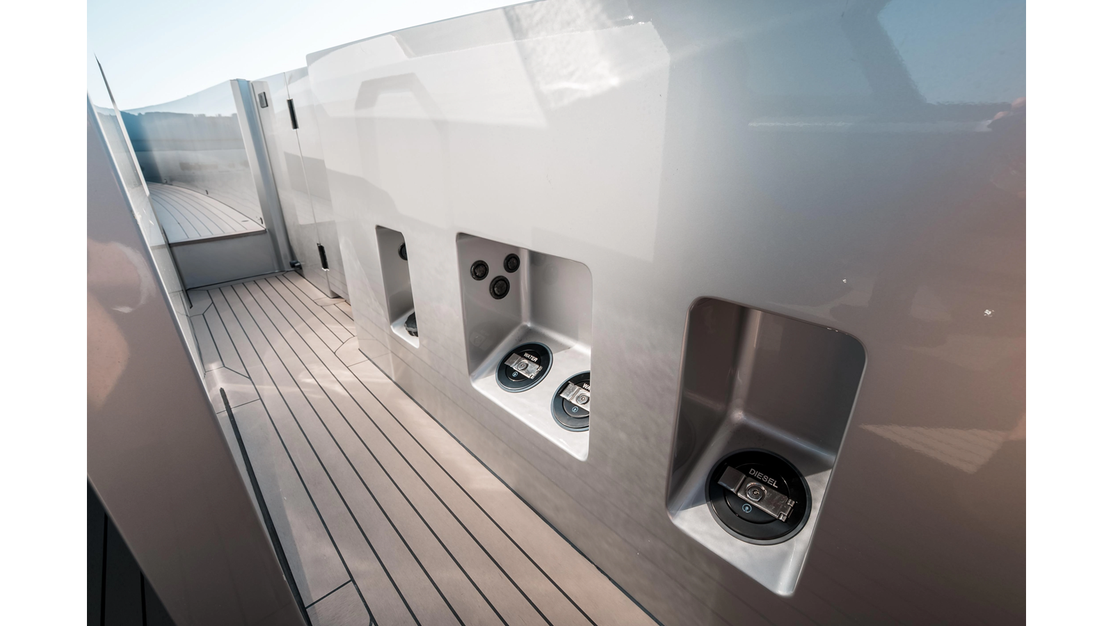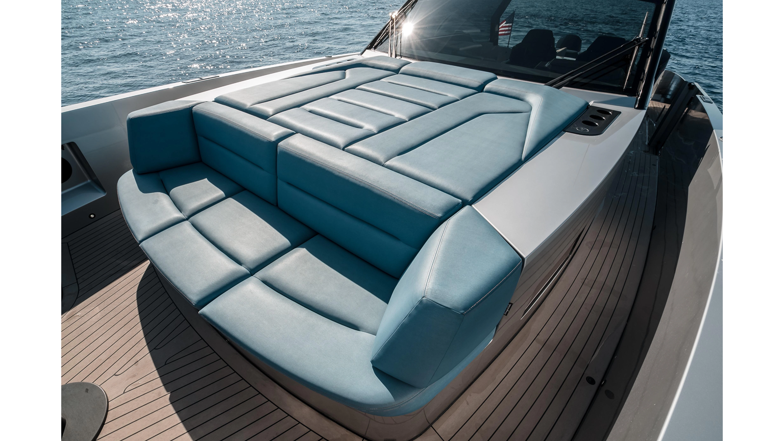 The quad Mercury V10 600HP outboards provide excessive performance, hole shot, and a top speed of over 60 knots. The joystick (with skyhook) and bow thruster make maneuvering in tight spaces effortless, while the SeaKeeper 6 and ZipWake automatic interceptor tabs add stability both at speed and rest.
