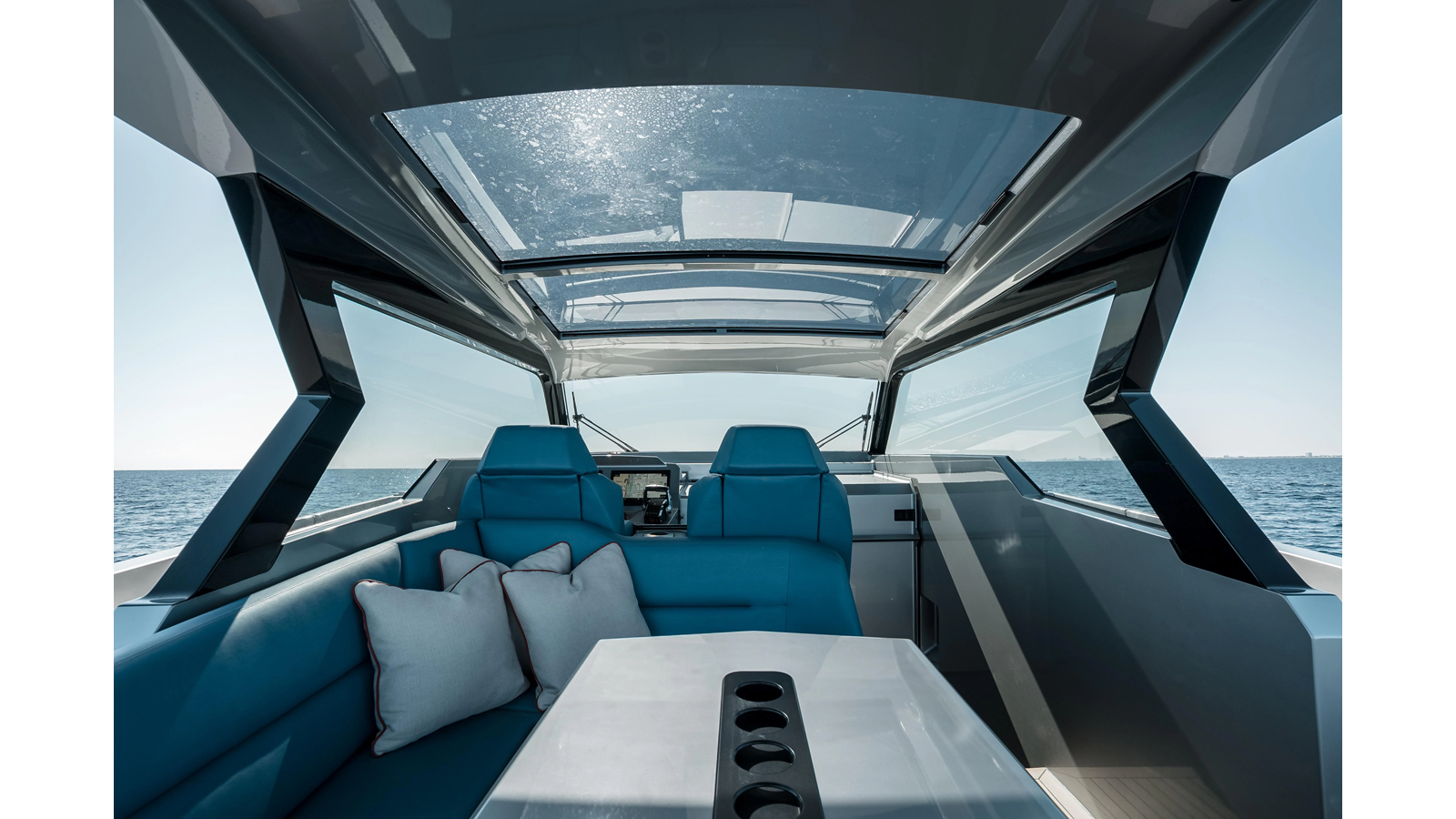 - 3-Sided Glass Enclosure with Helm AC and Walkaround Side Decks to Forward Seating and Sunpad