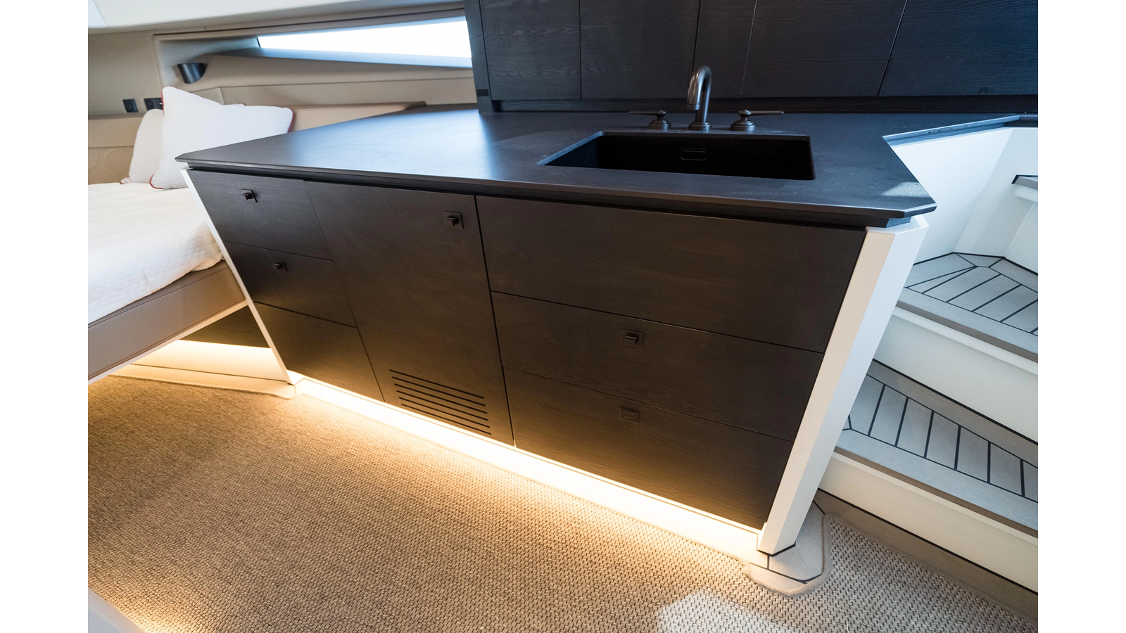 - Galley to Stbd with Isotherm Ice Maker, Microwave, Sink, and Storage