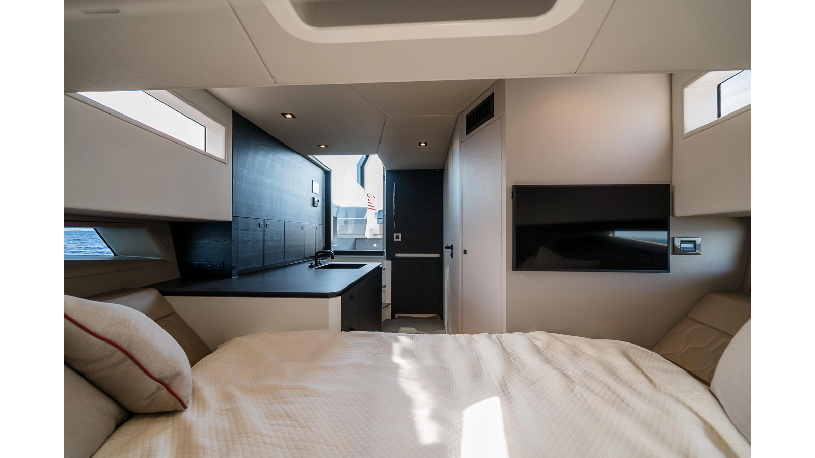 - Cabin with Separate Head and Shower, Full Berth, Galley, and Hull-Side Windows