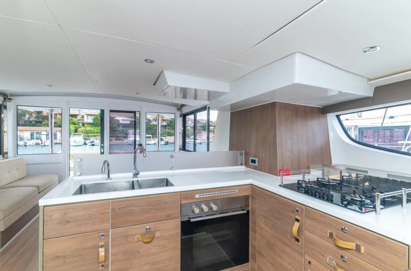 Teak in key exterior areas, cockpit cushions, sunpads, forward lounge, davits, American-style fridge with ice maker, oven and cooktop, Lofrans 1200 W windlass (remote), Delta 25 kg anchor + Bruce 20 kg spare, 50 m chain (10 mm).