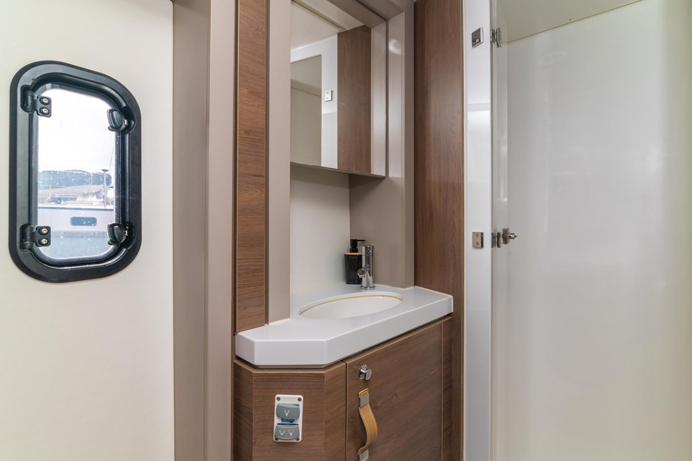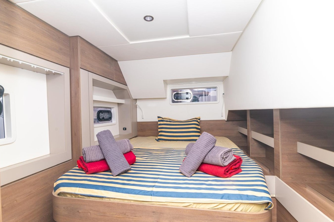 All four double cabins are en-suite with separate shower areas, while the additional twin bunk cabin makes the yacht ideal for families or mixed groups. The forward starboard locker is fitted out as a skipper’s cabin.