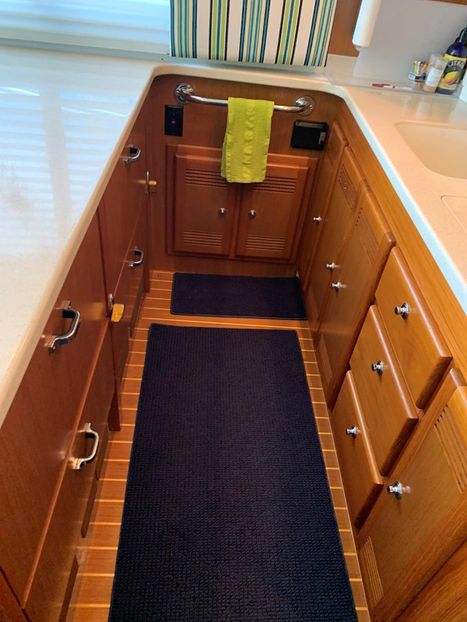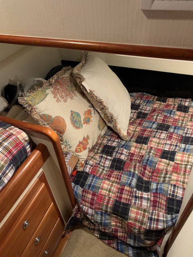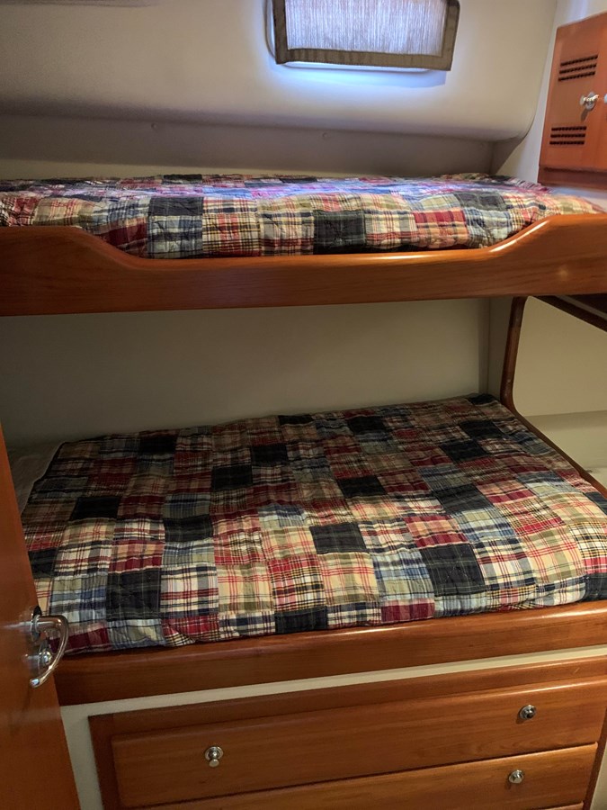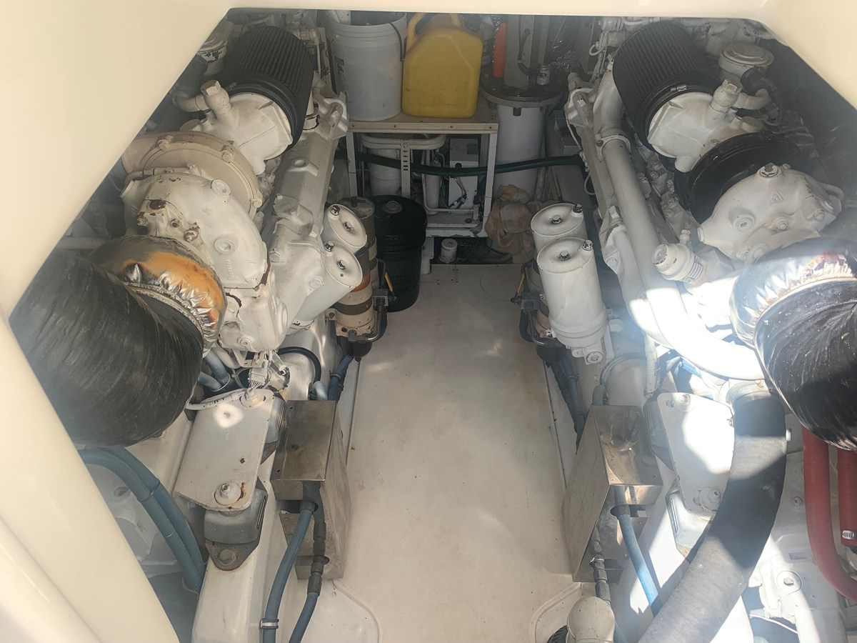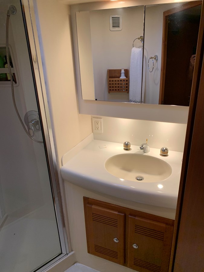 The Master Stateroom features a walk around Queen berth forward with storage drawers below and hanging lockers. Two full heads with separate stall showers both on port side. One opens to the master cabin and one opens to the companionway. The guest cabin is uniquely arranged with upper and lower berths on the starboard side and a full berth mid-cabin. The washer/dryer combo is tucked away in the companionway. The salon features the galley up with Corian countertops and Sub-Zero refrigerator/freezer drawers. The dinette and entertainment center is to starboard. There is an L-shaped settee with rod storage and the electrical panel and icemaker is to starboard. Full tackle center freezer and engine room access in the cockpit, two in deck fish boxes , fighting chair with rocket launcher and transom live well. Her bridge has a well arranged fully equipped helm with ladder back helm seats.