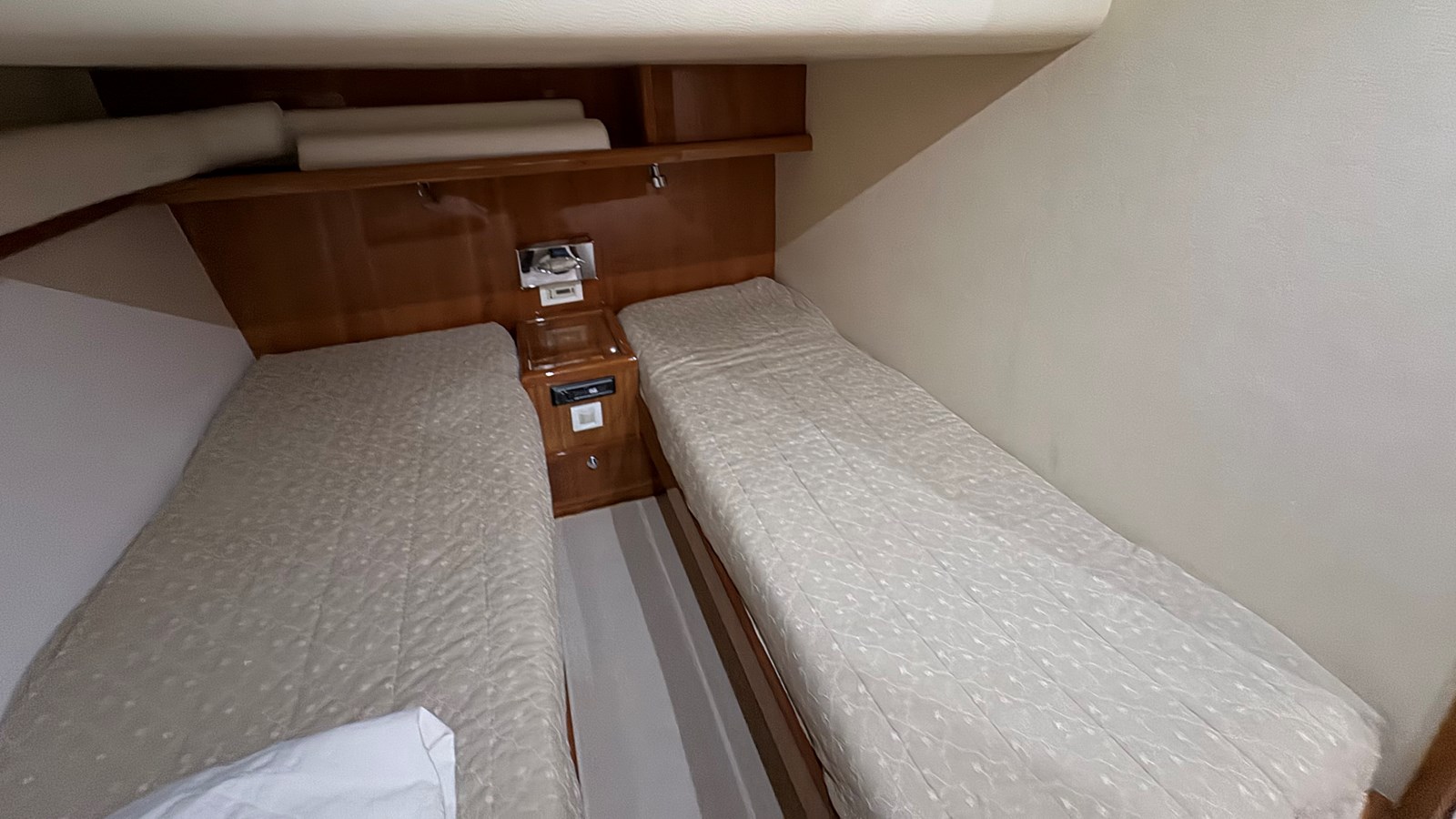 The salon - galley - dinette layout is spacious and practical. There is room to relax or entertain in comfort with a full complement of standard features and amenities. The second cabin is unique, with side by side twin berths instead of the more common over and under berths. Unusual in a boat of this size is the elevated cocktail area forward of the dinette, and the possibility of a washer & dryer stack in the companionway.