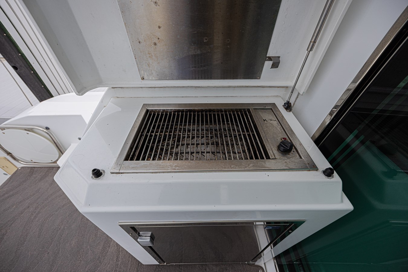 - Custom-built pedestal-style display area at the helm with dual Garmin multifunction displays.