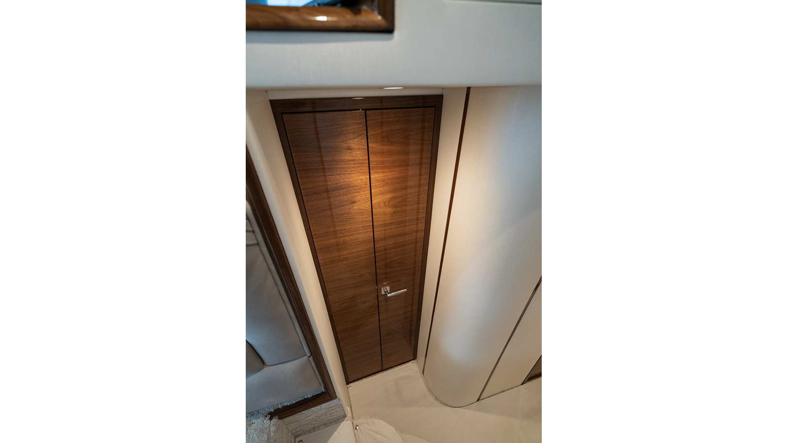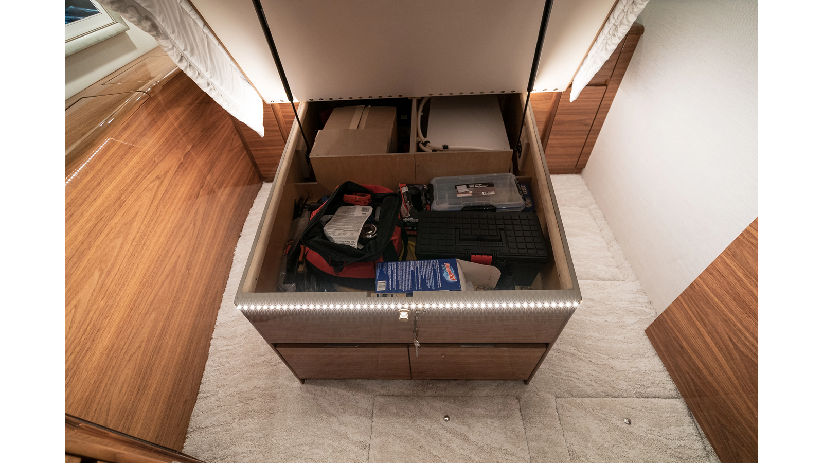- VIP Stateroom Forward: ---Bed, Upper - Lower Bunks And Lift Up Top With Gas Pistons And Maple-Lined Storage Underneath ---Hanging Locker ---Hatch, Bomar, For---edeck Hatch With Ocean Air Screen Shade System ---LED Overhead Lighting ---Reading Lights With Separate Switches ---Stereo ---Storage Cabinets, Port And Starboard Sides of Bed ---Storage Drawers Under Bed, (2) Large Drawers ---Wood Shelf