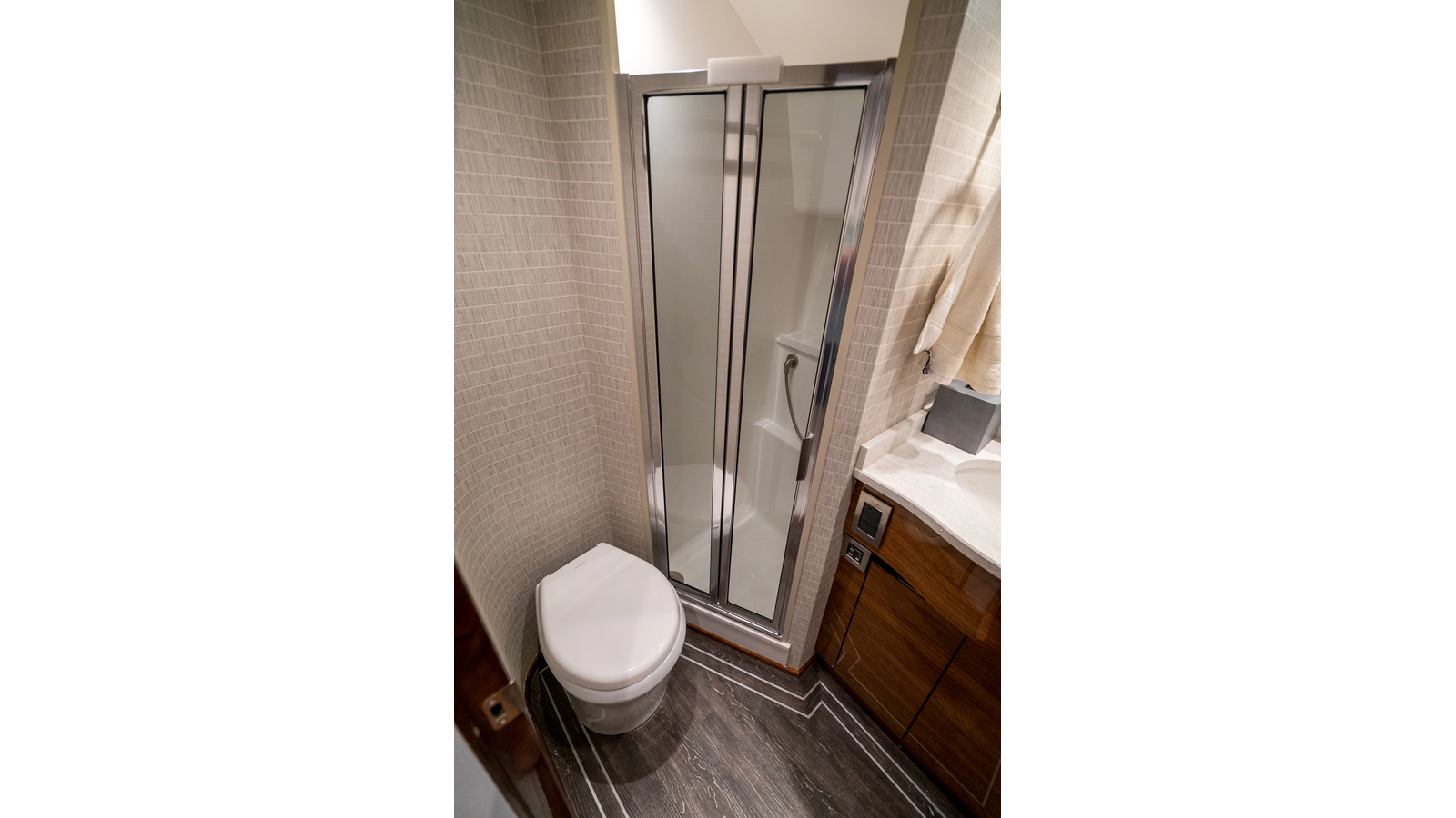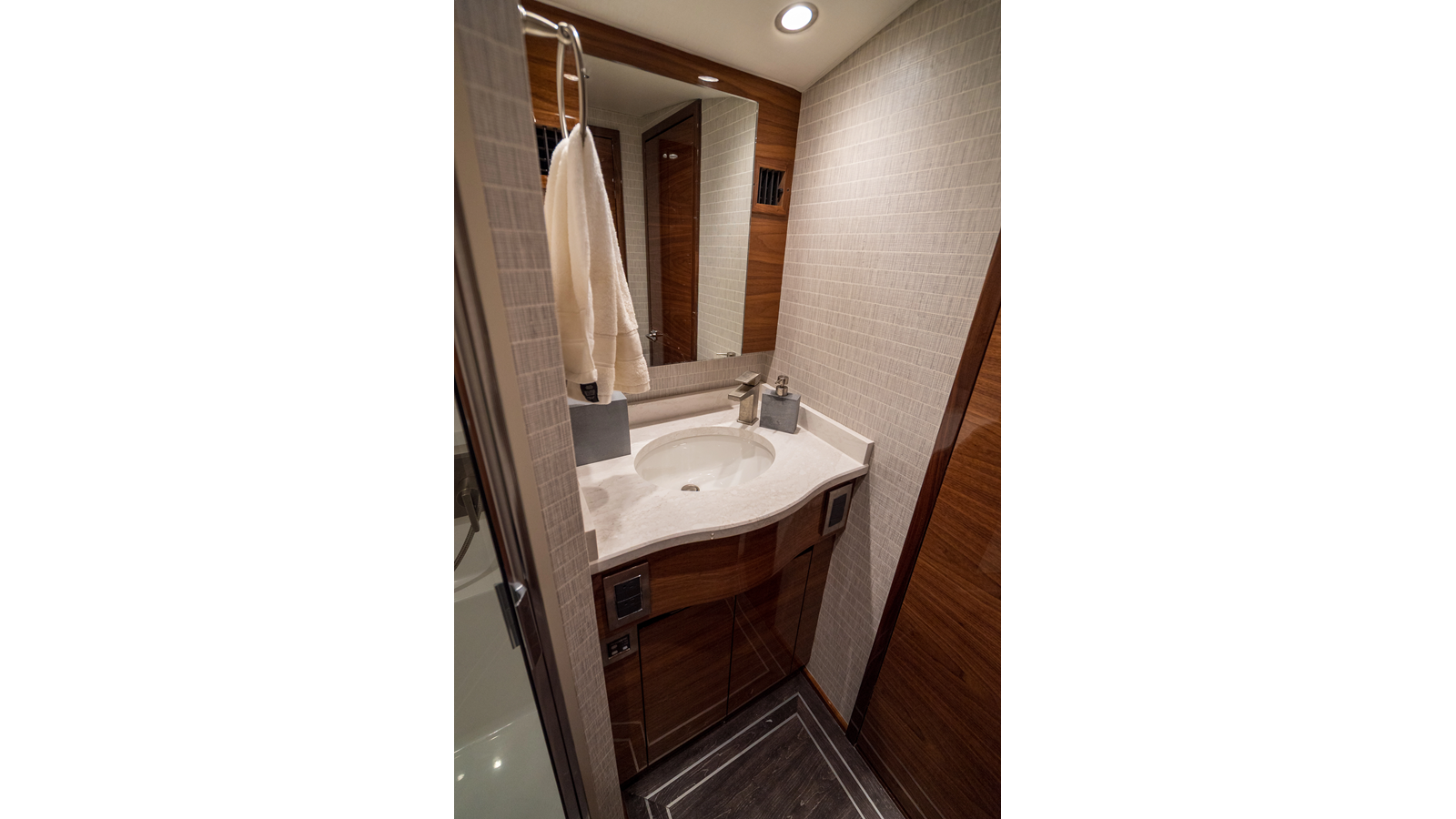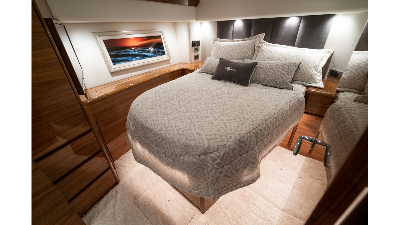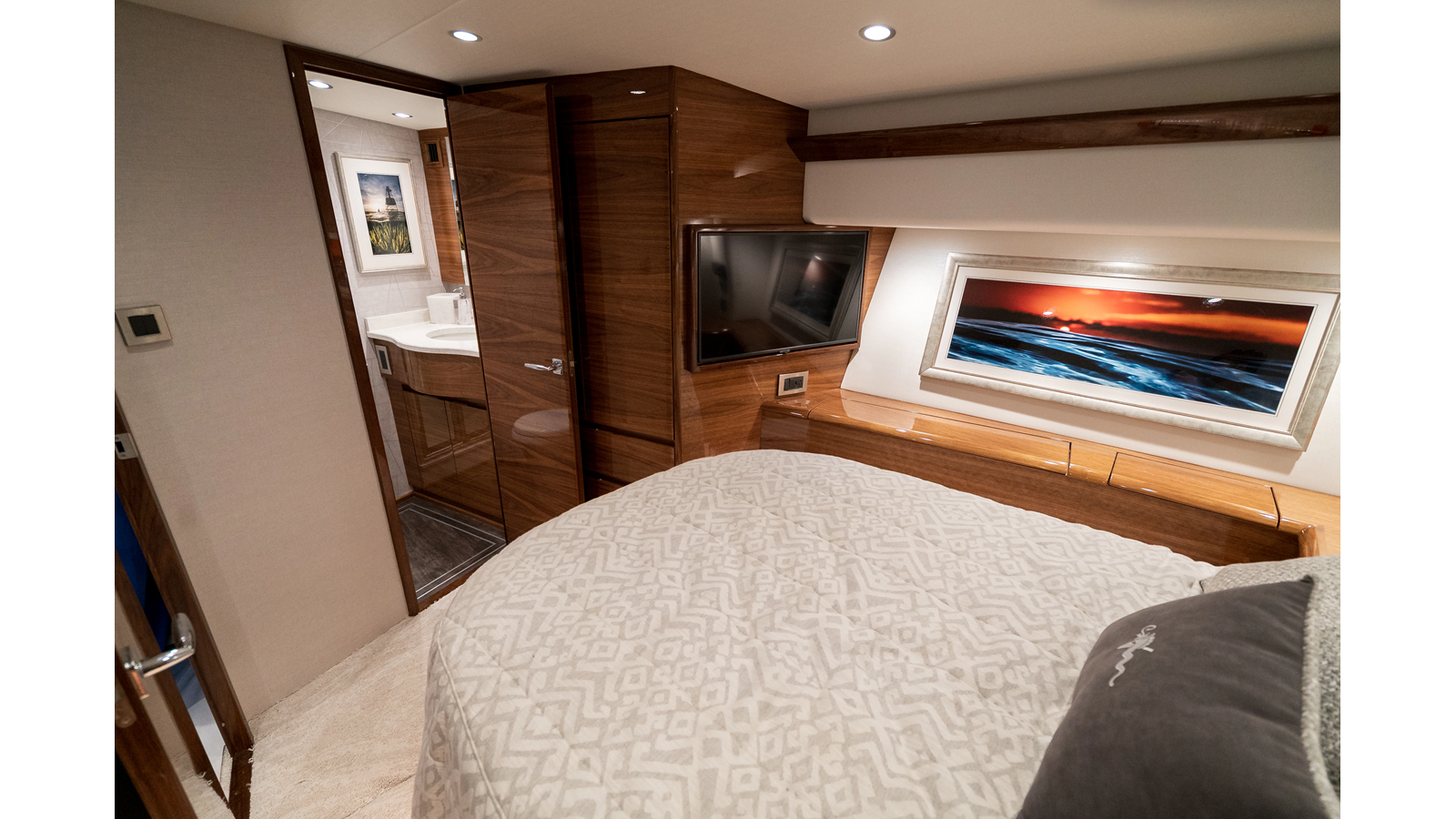 - Maser Stateroom to Stbd Midship: ---Bed, Queen-Size, Walk-Around Fore And Aft Bed, Lift Up Top With Gas Pistons And Maple-Lined Storage Underneath ---Drawer Storage Under Bed, (2) Large Drawers ---End Tables On Either Side Of Bed With Drawers and Storage ---Hanging Locker ---Lighting, Overhead LED Lights And Decorative Indirect Rope Lighting ---Reading Lights, Overhead With Separate Switches ---Stereo 12v w/ Speaker Recessed in Headliner ---TV ---Head with Shower, Sink, Mirror, and Storage