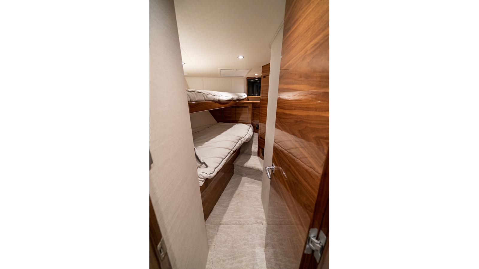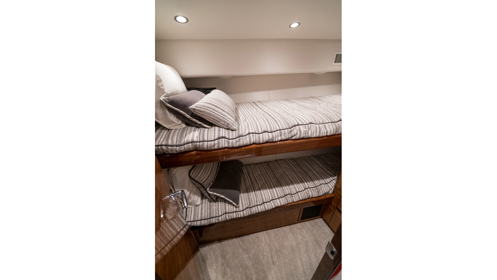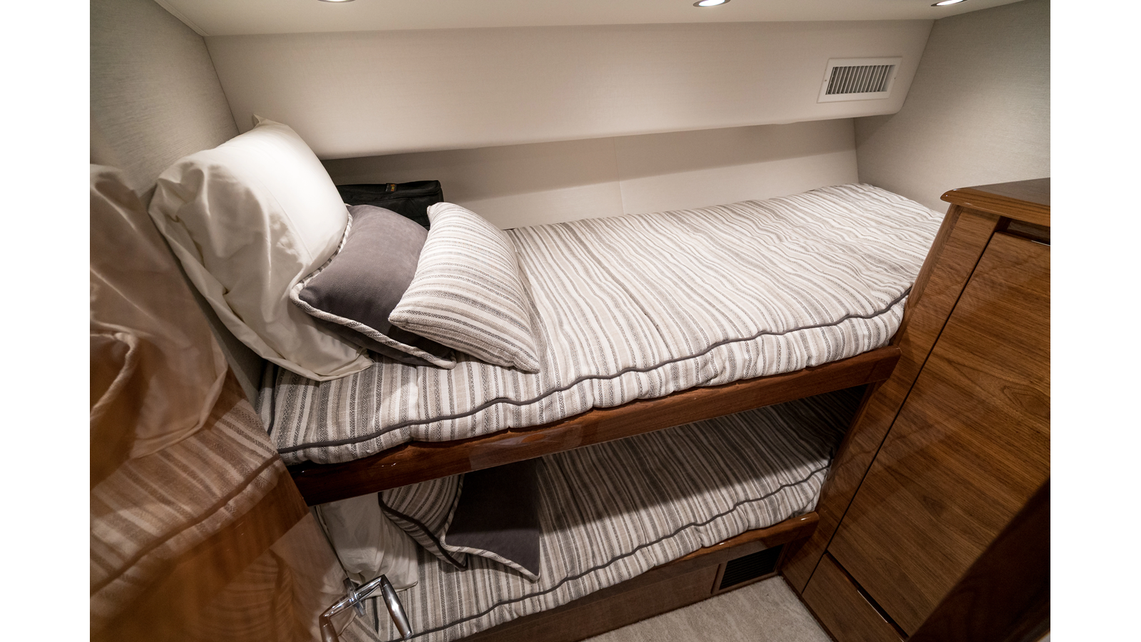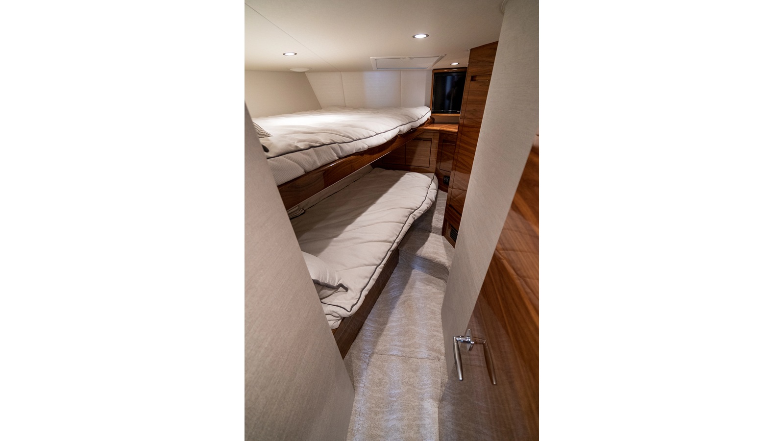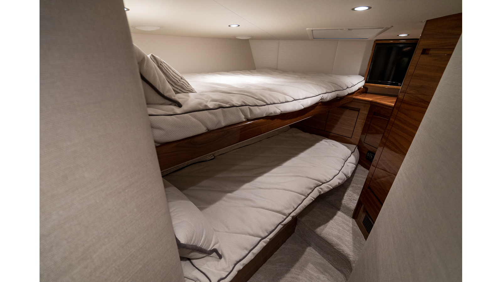- Guest Stateroom to Port Midship: ---Bed, Upper - Lower Crossover Bunks ---Storage Underneath ---Hanging Locker ---Stereo
