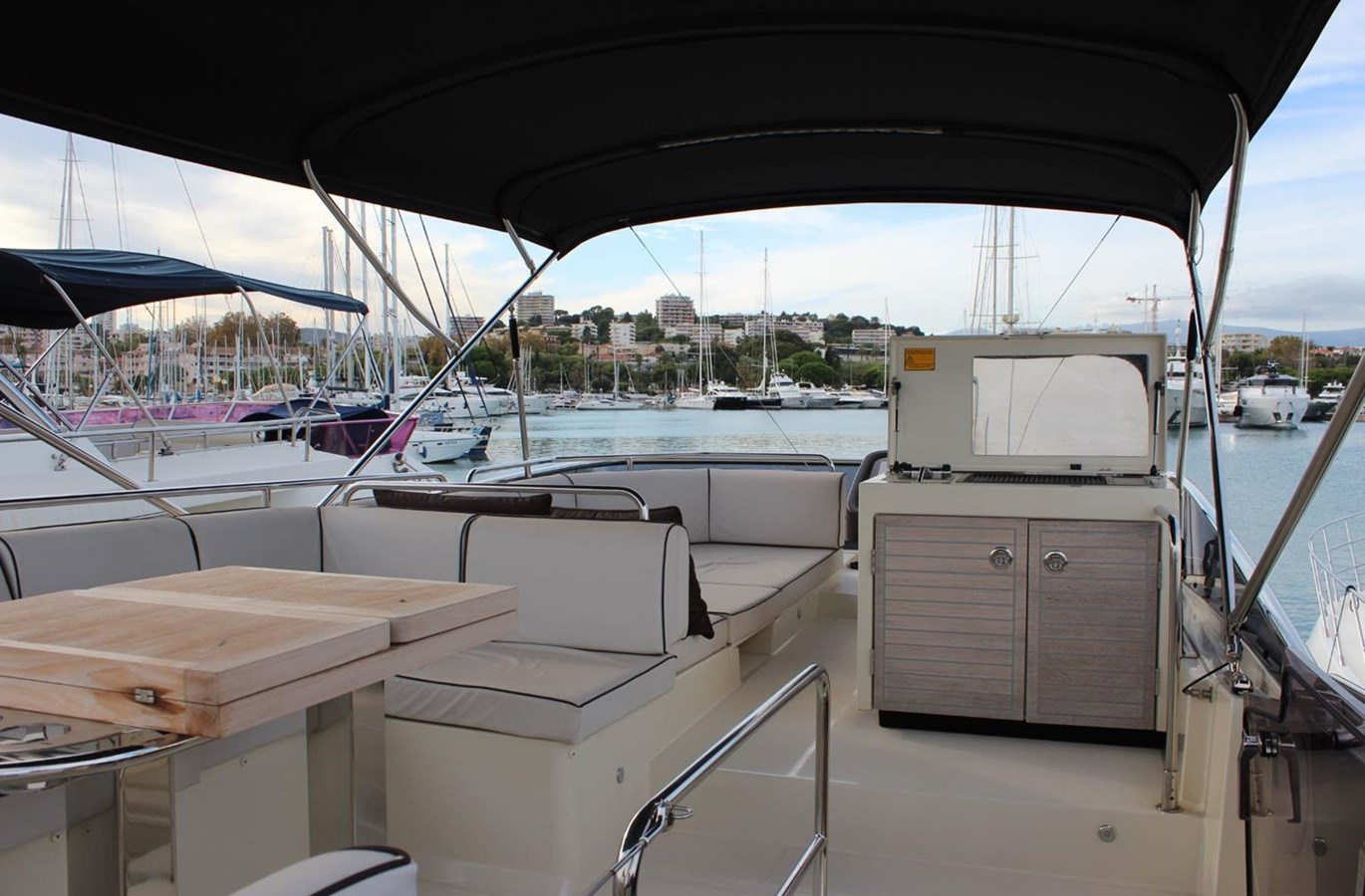 The Beneteau Monte Carlo 5 motor yacht is a timeless Mediterranean classic. Thanks to its retractable awning, guests can lounge in welcome shade or bask in the sun in the open cockpit.