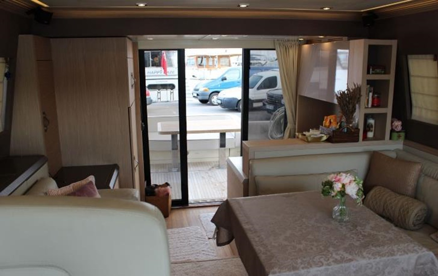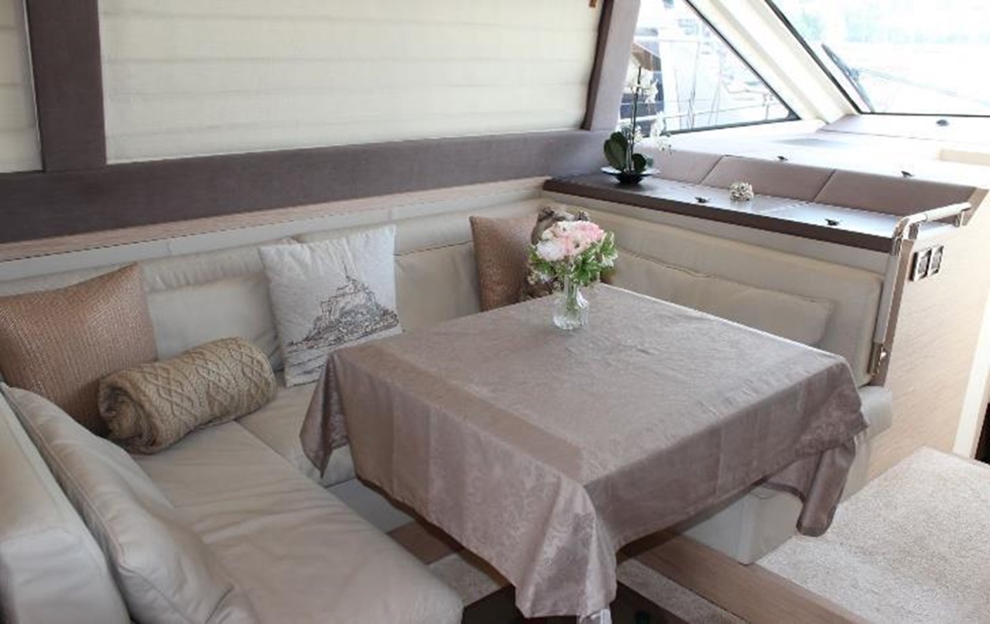 Stepping inside, Monte Carlo 5 reveals a light-filled interior defined by a soft, contemporary colour palette that amplifies the natural light flowing through the panoramic windows. The spacious salon is elegantly arranged with a fully equipped galley and a U-shaped lounge with a fold-away table, creating a refined yet welcoming environment. This space is perfectly suited for relaxed entertaining, whether enjoying pre-dinner aperitifs or hosting an intimate dining experience for up to six guests.
