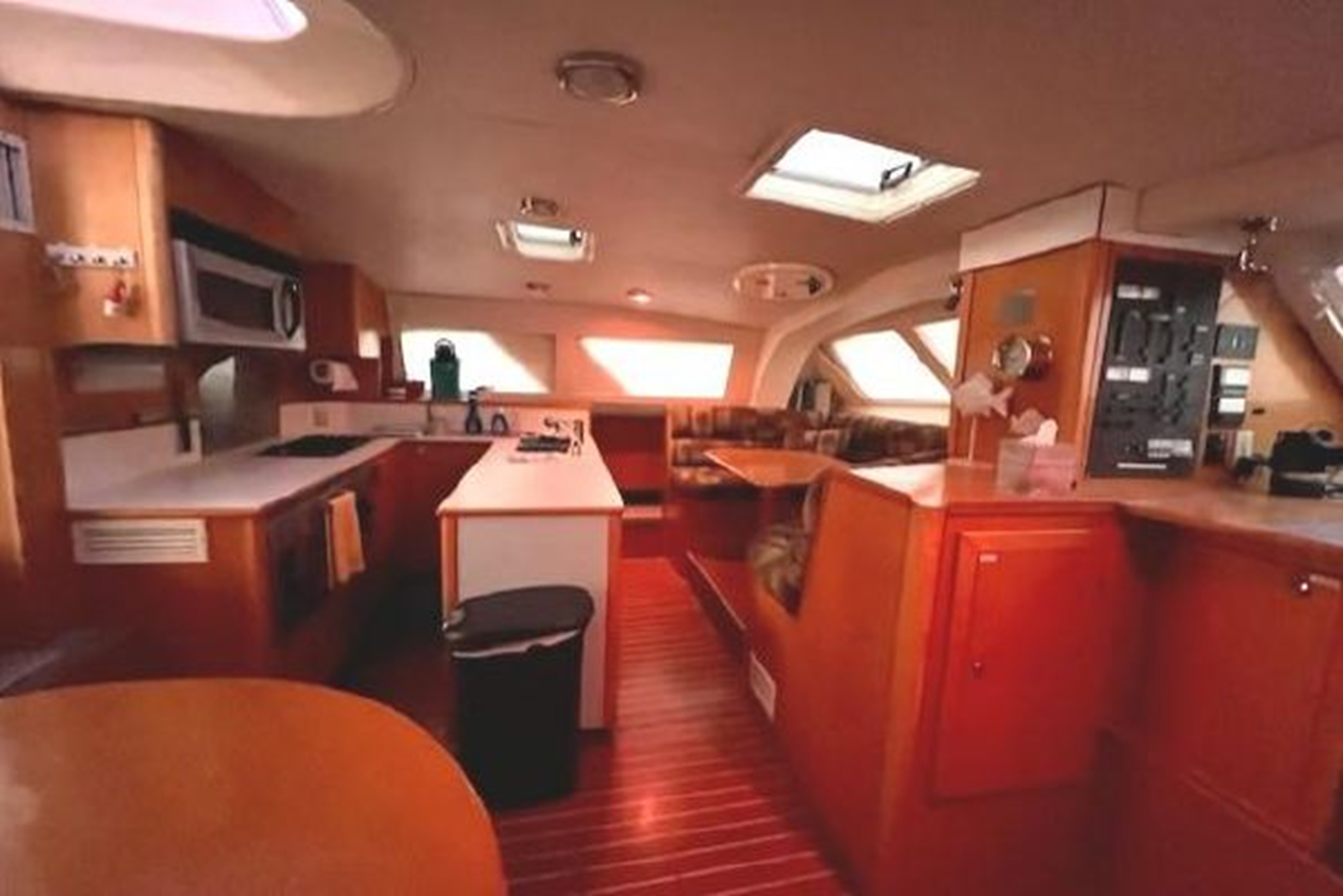 Entry into the Salon through an outward opening door. To port is "U" shaped galley with: stove/oven, microwave, exhaust hood, LPG controls, sink under-counter refrigerator, counter and storage space. Forward to port is a large "U" shaped galley table with warp around seating. To starboard is another "U" shaped table with wrap around seating that is over the inverter/charger, and HVAC units. Forward is the AC/DC power panels, and NAV station.
